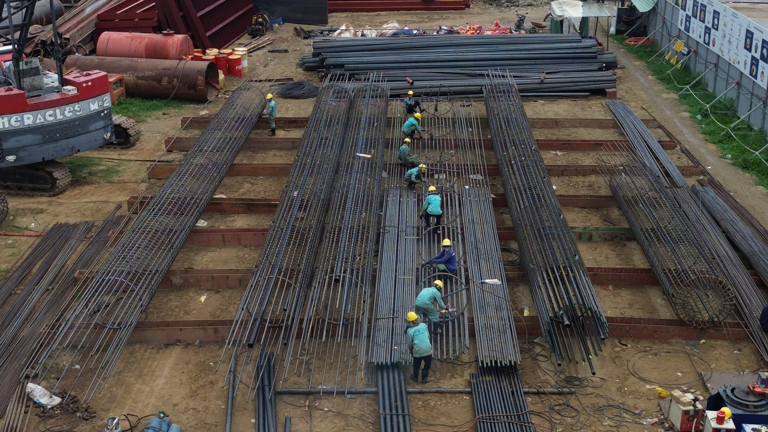 Trên mặt bằng công trường, hàng chục cán bộ, kỹ sư và công nhân làm việc liên tục, phối hợp nhịp nhàng giữa các tổ thi công. Nhiều thiết bị chuyên dụng hoạt động xuyên suốt, từ máy khoan, máy hàn đến xe cơ giới, tạo nên không khí lao động khẩn trương.