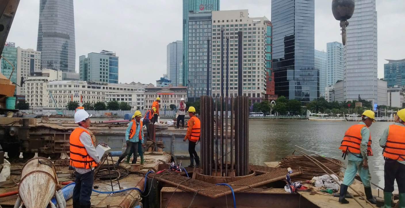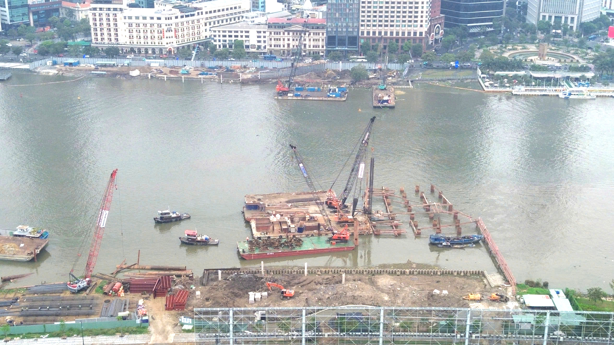Theo ghi nhận tại công trường, khu vực thi công cầu đi bộ qua sông Sài Gòn đang diễn ra sôi động trên cả mặt nước và hai bên bờ. Trên sông, nhiều sà lan cỡ lớn được neo đậu, kết hợp với các cẩu trục bánh xích và cẩu tháp cao vươn cần, phục vụ thi công khoan cọc nhồi và lắp đặt kết cấu trụ cầu. Dọc bờ sông, các bó thép, ống thép cỡ lớn được tập kết ngay ngắn, sẵn sàng cho các công đoạn tiếp theo.