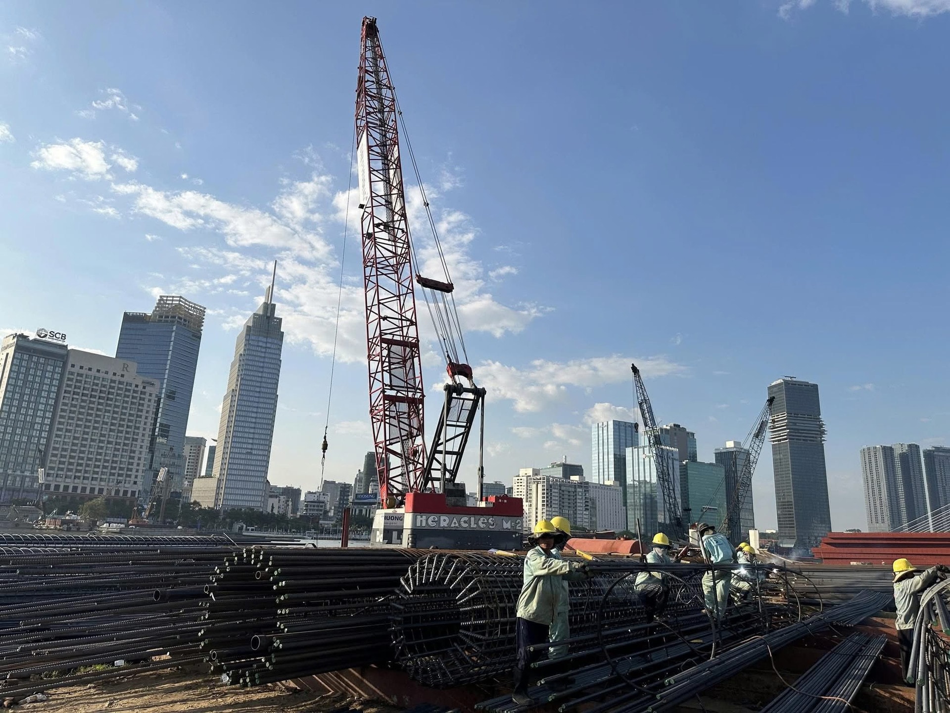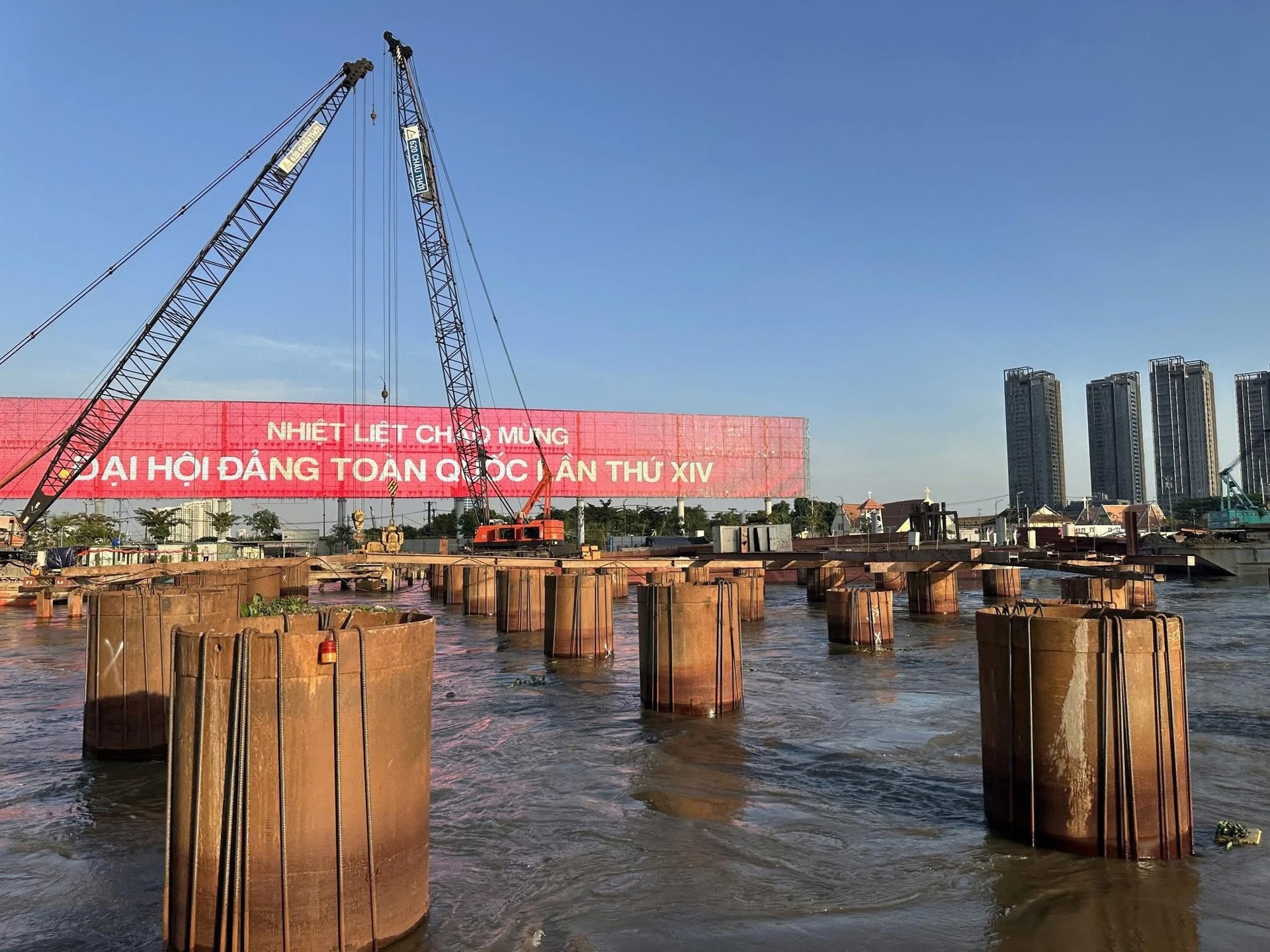 Cận cảnh công trường xây dựng cầu đi bộ bắc qua sông Sài Gòn.