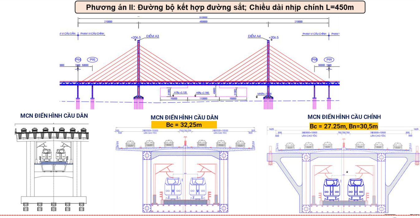 Đơn vị tư vấn nghiên cứu hai phương án chính: xây riêng hai cầu cho đường bộ và đường sắt; hoặc xây một cầu chung. Nếu đi riêng, cầu đường bộ có tổng mức đầu tư khoảng 23.914 tỷ đồng, khi cầu đường sắt cần 9.483 tỷ đồng, tổng chi phí khoảng 33.397 tỷ đồng. Ngược lại, phương án cầu đi chung chỉ cần 29.525 tỷ đồng. Như vậy, sơ bộ kinh phí đầu tư tiết kiệm được khoảng từ 3.800 - 5.000 tỷ đồng (tùy vào từng phương án) so với phương án xây dựng 2 cầu độc lập (khoảng 15 - 19%).