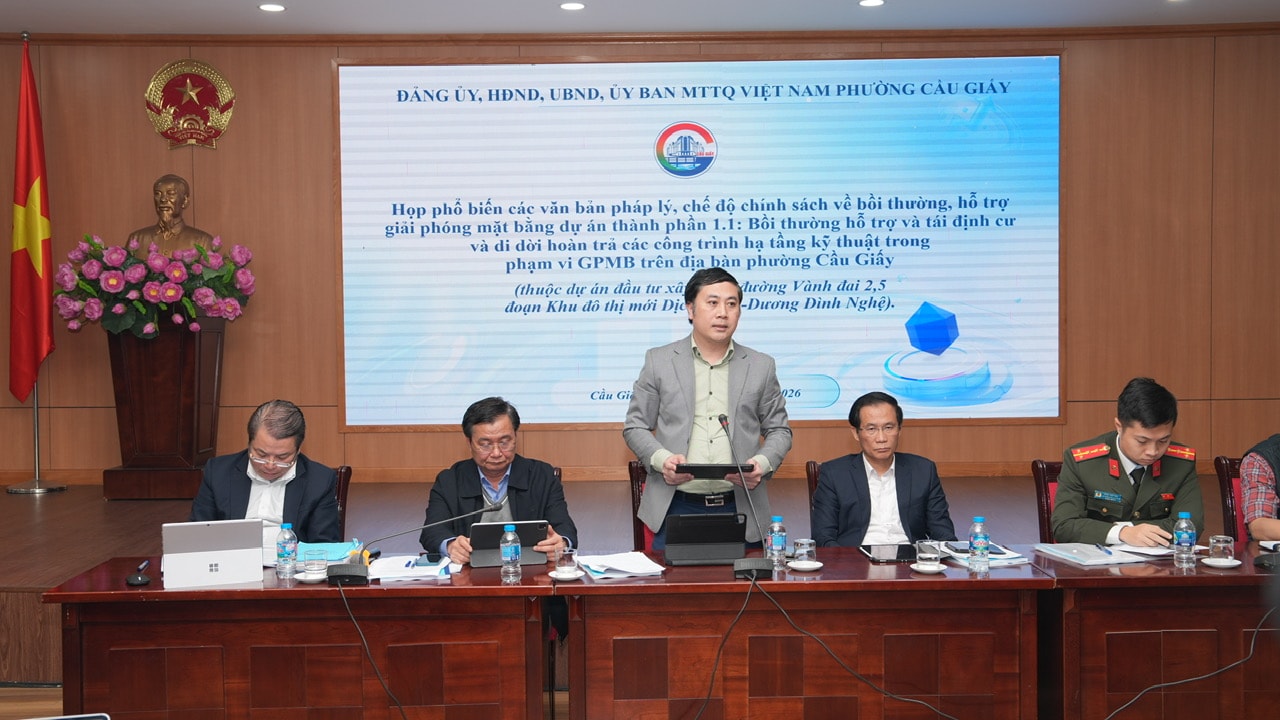 Cụ thể, chính quyền phường đã thông tin về Lệnh xây dựng công trình khẩn cấp, về quy hoạch, chỉ giới đường đỏ, quy mô tuyến đường: Chiều dài tuyến Vành đai 2,5 đoạn từ Khu đô thị mới Dịch Vọng đến đường Dương Đình Nghệ dài 710m, mặt cắt đường 50m; thu hồi tổng diện tích đất 35.100m2 (trong đó thu hồi diện tích đất phường Cầu Giấy là 30.520m2, phường Yên Hòa 4.580 m2); thu hồi đất 110 hộ gia đình, trong đó có tập thể quân đội Bệnh viện 354, phải di chuyển trên 370 mộ tại nghĩa trang Mỏ Quang; thông tin chi tiết bảng giá bồi thường đất ở đủ điều kiện tại các vị trí tiếp giáp đường Dương Đình Nghệ, Thành Thái và phố Hoa Bằng (hệ số điều chỉnh giá đất K= 1, làm căn cứ tính tiền bồi thường theo Quyết định 89/2025/QĐ-UBND ngày 31-12-2025 của UBND thành phố); các chế độ, chính sách hỗ trợ, hỗ trợ khác theo quy định tại Nghị định số 88/2024/NĐ-CP ngày 15-7-2024 của Chính phủ quy định về bồi thường, hỗ trợ, tái định cư khi Nhà nước thu hồi đất; Quyết định số 56/2024/QĐ-UBND ngày 6-9-2024, Quyết định số 38/2025/QĐ-UBND ngày 30-6-2025 của UBND thành phố về việc quy định nội dung bồi thường, hỗ trợ, tái định cư khi Nhà nước thu hồi đất trên địa bàn thành phố Hà Nội...