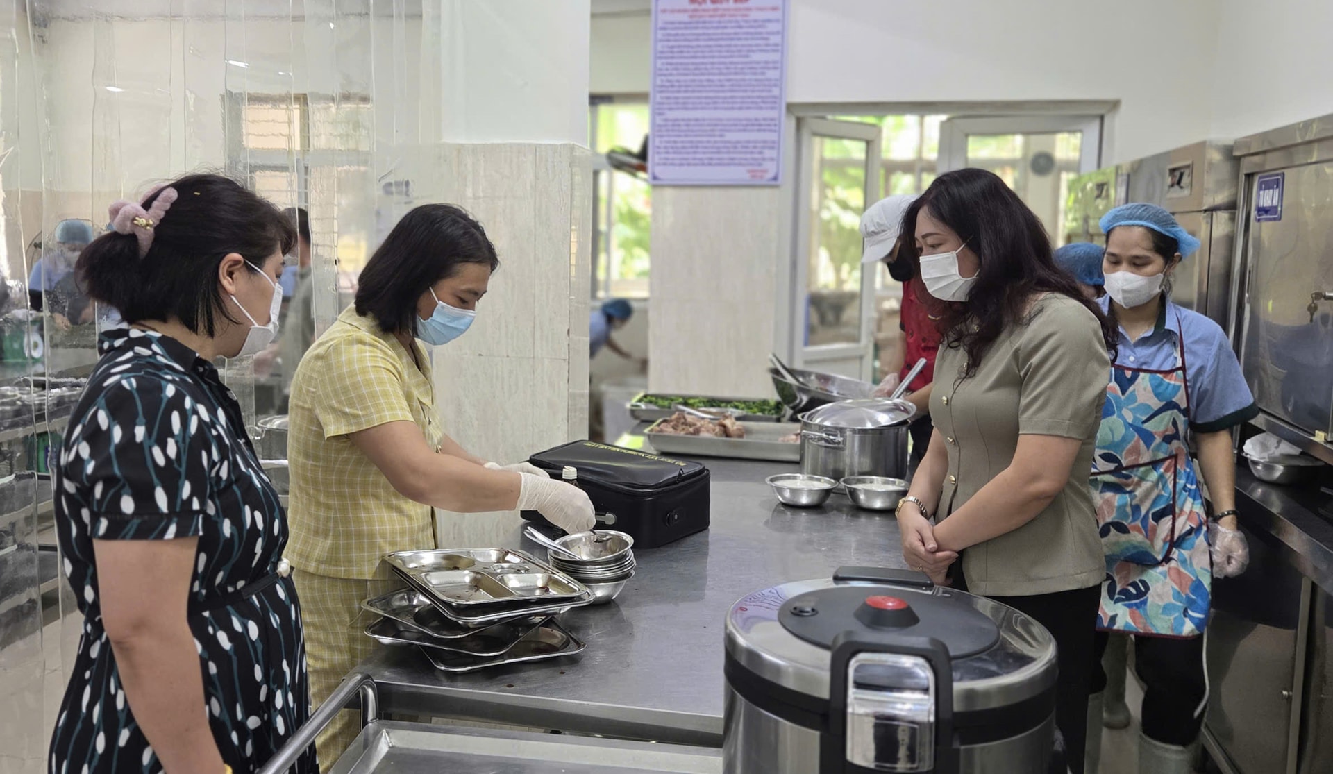 Lực lượng chức năng phường Cầu Giấy kiểm tra công tác đảm bảo vệ sinh an toàn thực phẩm tại các bếp ăn tập thể. Ảnh: Vân Nhi