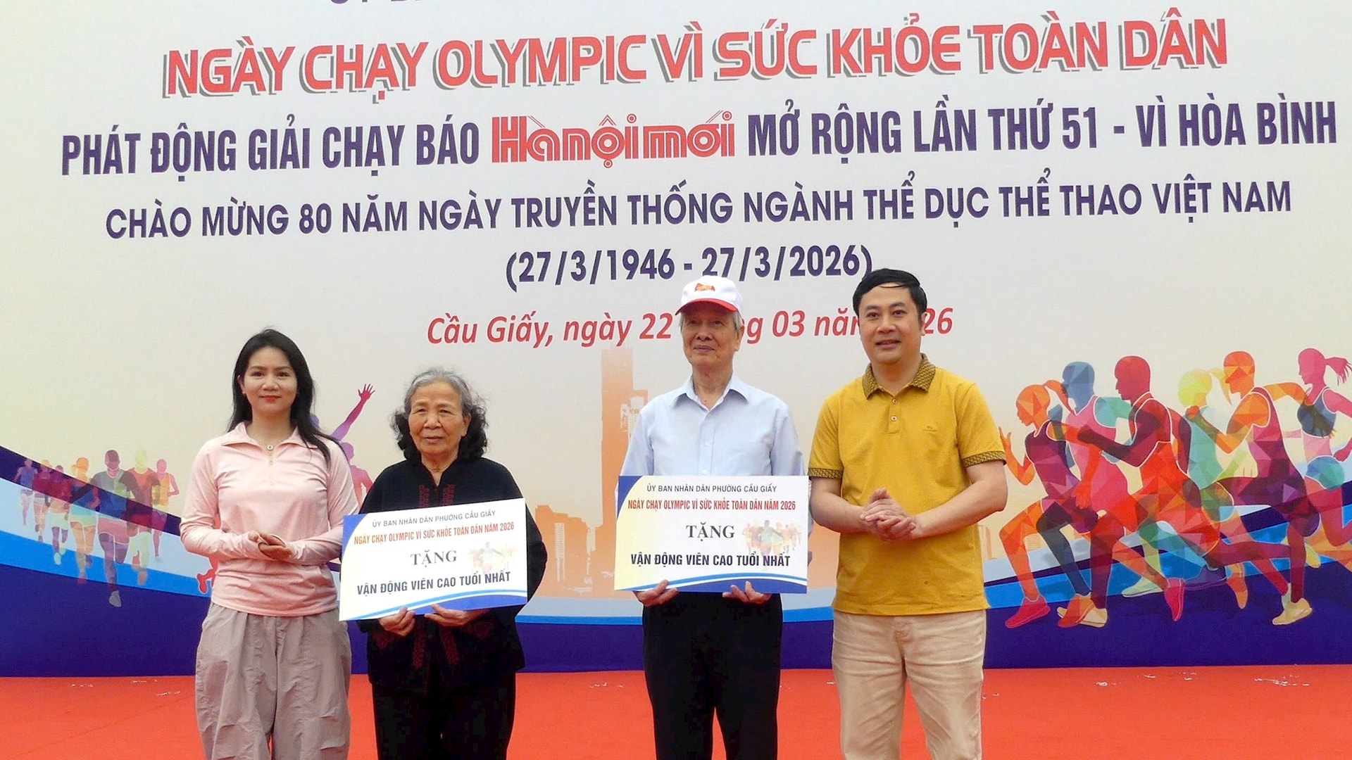 Lãnh đạo phường Cầu Giấy tặng quà cho các vận động viên cao tuổi nhất tham gia Ngày chạy Olympic. Ảnh: Công Sơn