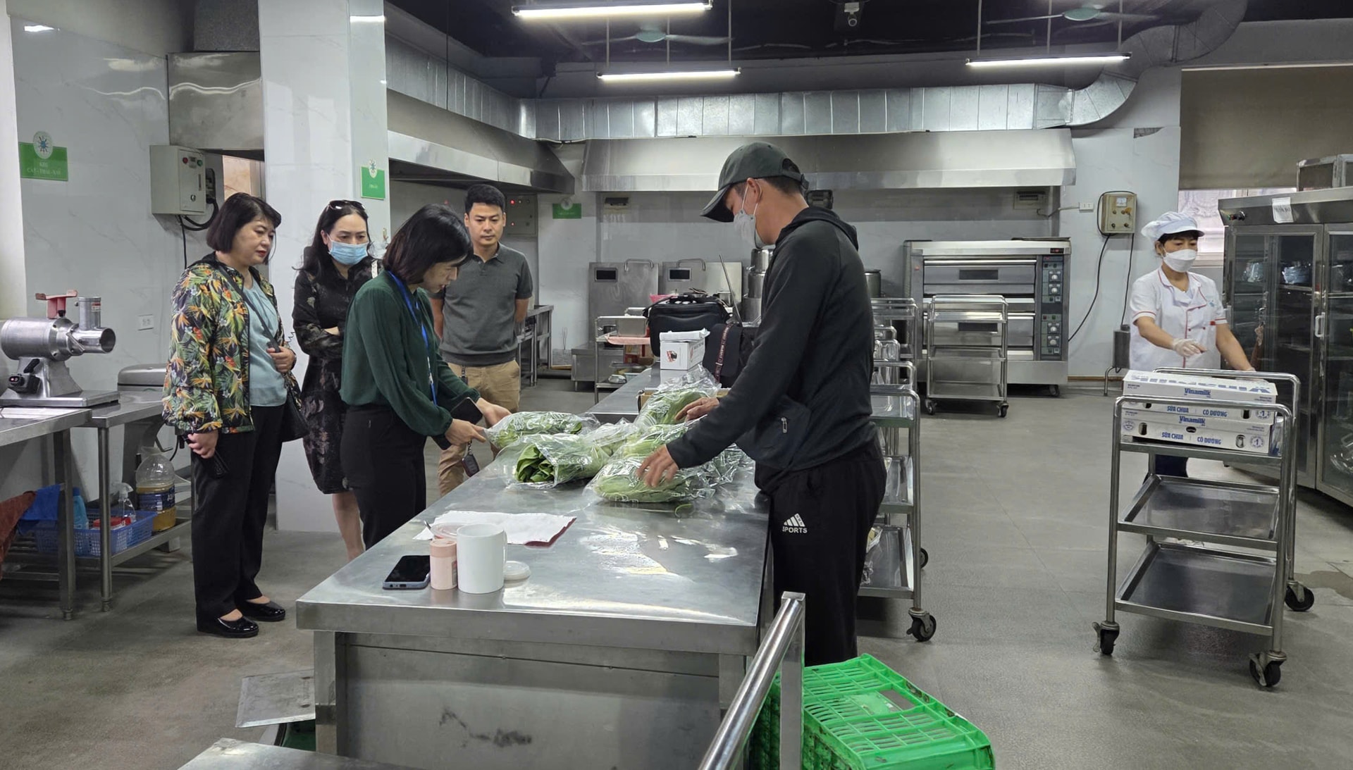 Lực lượng chức năng phường Cầu Giấy kiểm tra công tác đảm bảo vệ sinh an toàn thực phẩm tại các bếp ăn tập thể. Ảnh: Vân Nhi