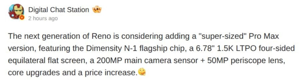 Việc bổ sung camera tiềm vọng và cảm biến độ phân giải siêu cao cho thấy OPPO Reno16 Pro Max có thể sẽ thay thế vị trí của bản Pro hiện tại, trở thành mẫu máy chủ lực mới của dòng Reno. Tuy nhiên, điều này cũng đồng nghĩa với việc giá bán của sản phẩm có thể sẽ tăng nhẹ để tương xứng với những nâng cấp đáng giá về phần cứng.
