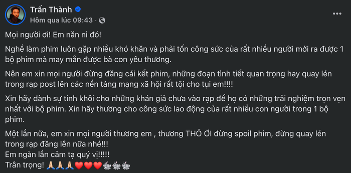 Trấn Thành năn nỉ khán giả đừng phát tán tình tiết phim lên mạng xã hội. (Ảnh: chụp màn hình)