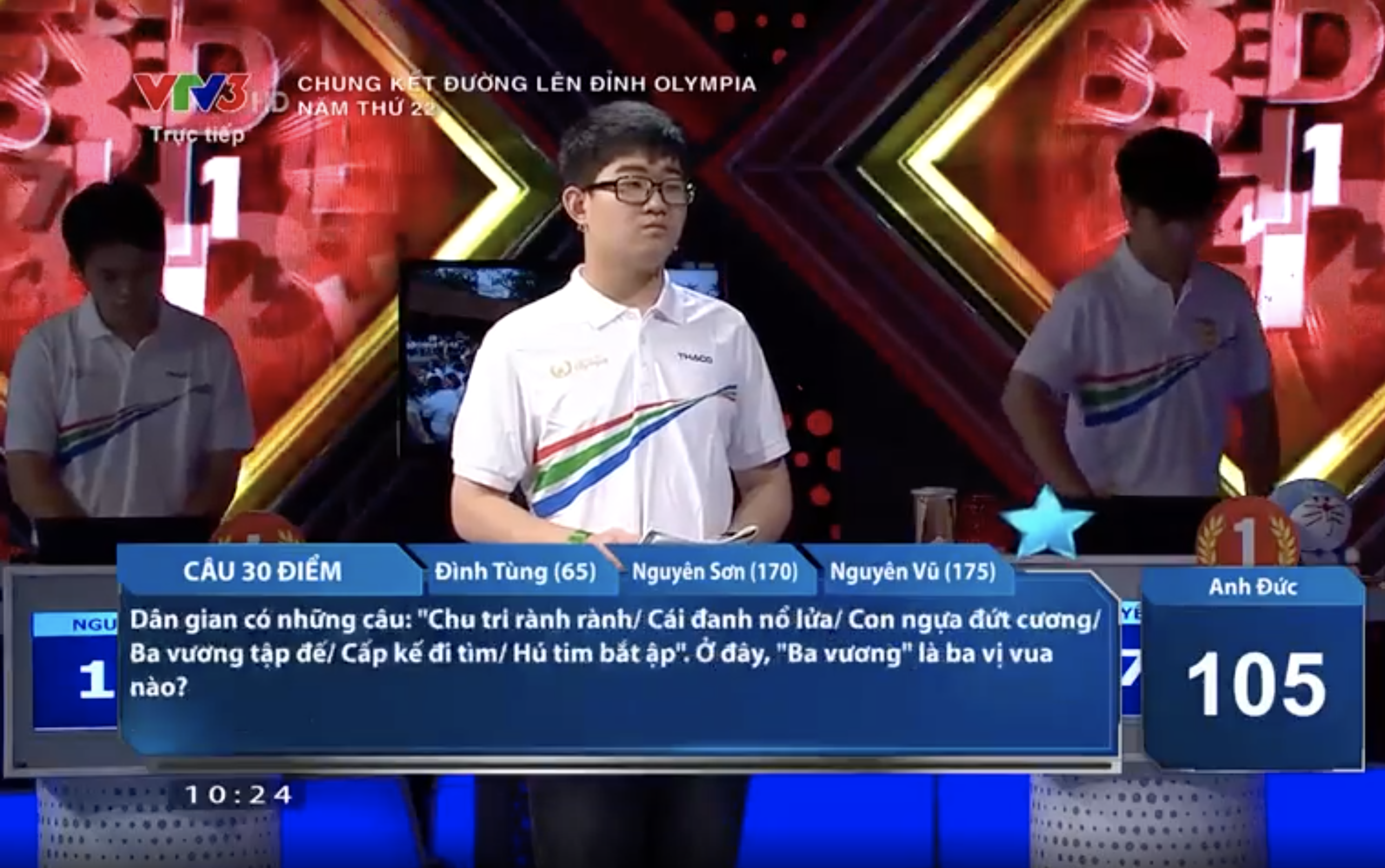 Tại chung kết năm Đường lên đỉnh Olympia năm thứ 22, phần thi Về đích của thí sinh Anh Đức xuất hiện câu hỏi mang yếu tố dân gian. Cụ thể, câu đố trích dẫn những câu vè: “Chu tri rành rành/Cái đanh nổ lửa/Con ngựa đứt cương/Ba vương tập đế/Cấp kế đi tìm/Hú tim bắt ập”. Thí sinh phải xác định “ba vương” là những vị vua nào?