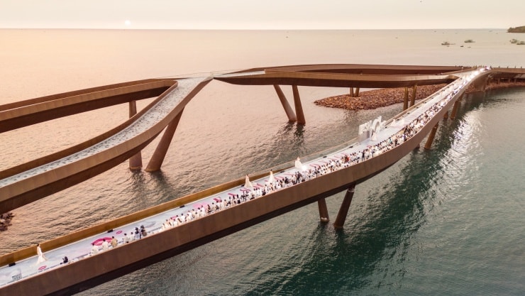Tại Phú Quốc, có một công trình kiến trúc không dùng để đi qua mà để kết nối những cảm xúc. Đó là Cầu Hôn, một biểu tượng mới của du lịch đảo ngọc. Với tổng chiều dài 800m, cây cầu gồm hai nhánh Bắc và Nam vươn mình ra biển, hướng vào nhau nhưng không chạm, để lại một khoảng cách chính xác 30cm.