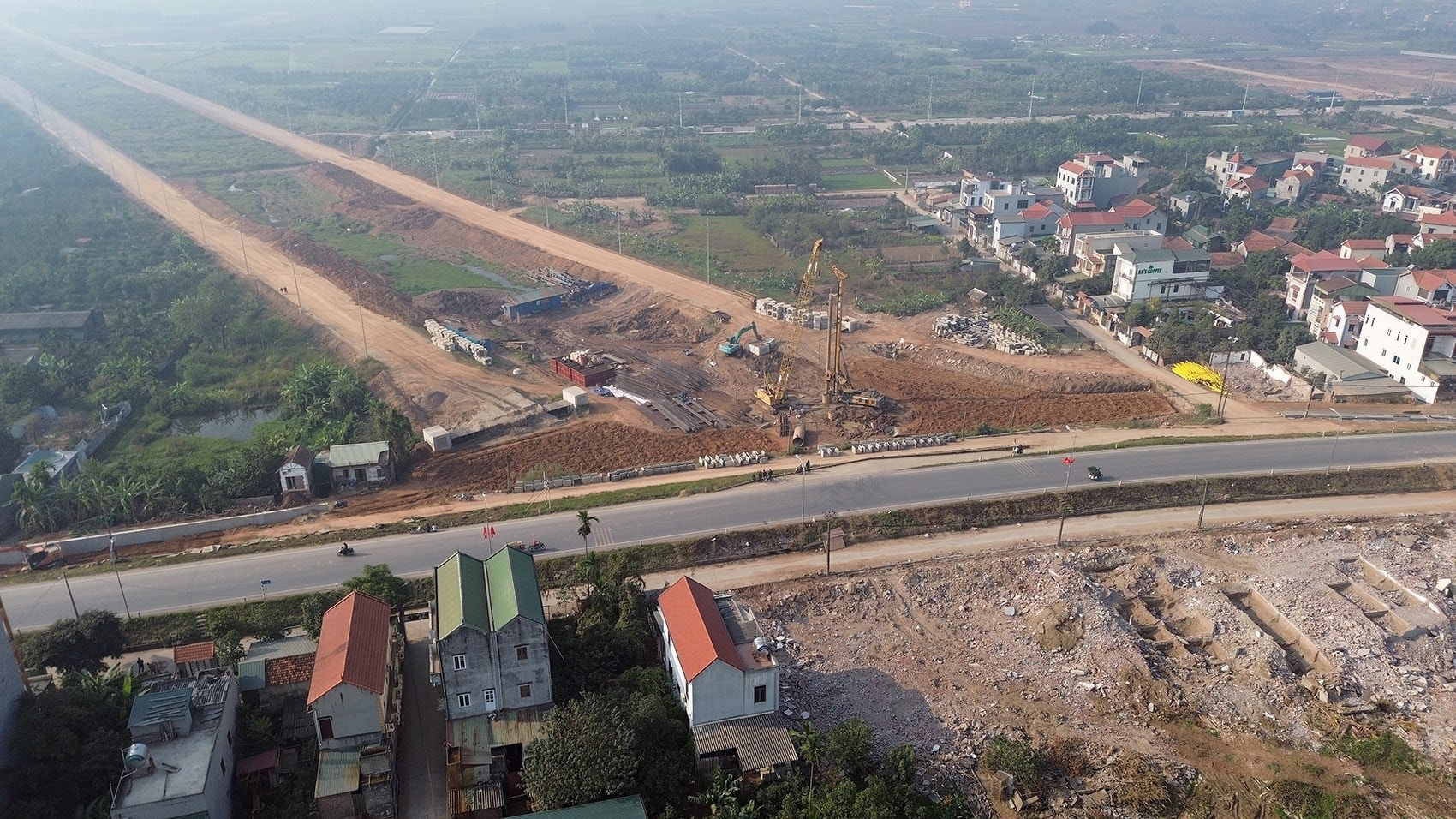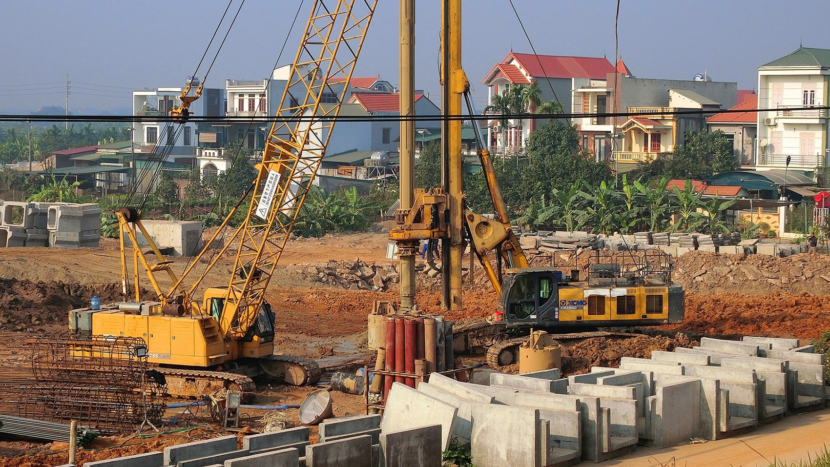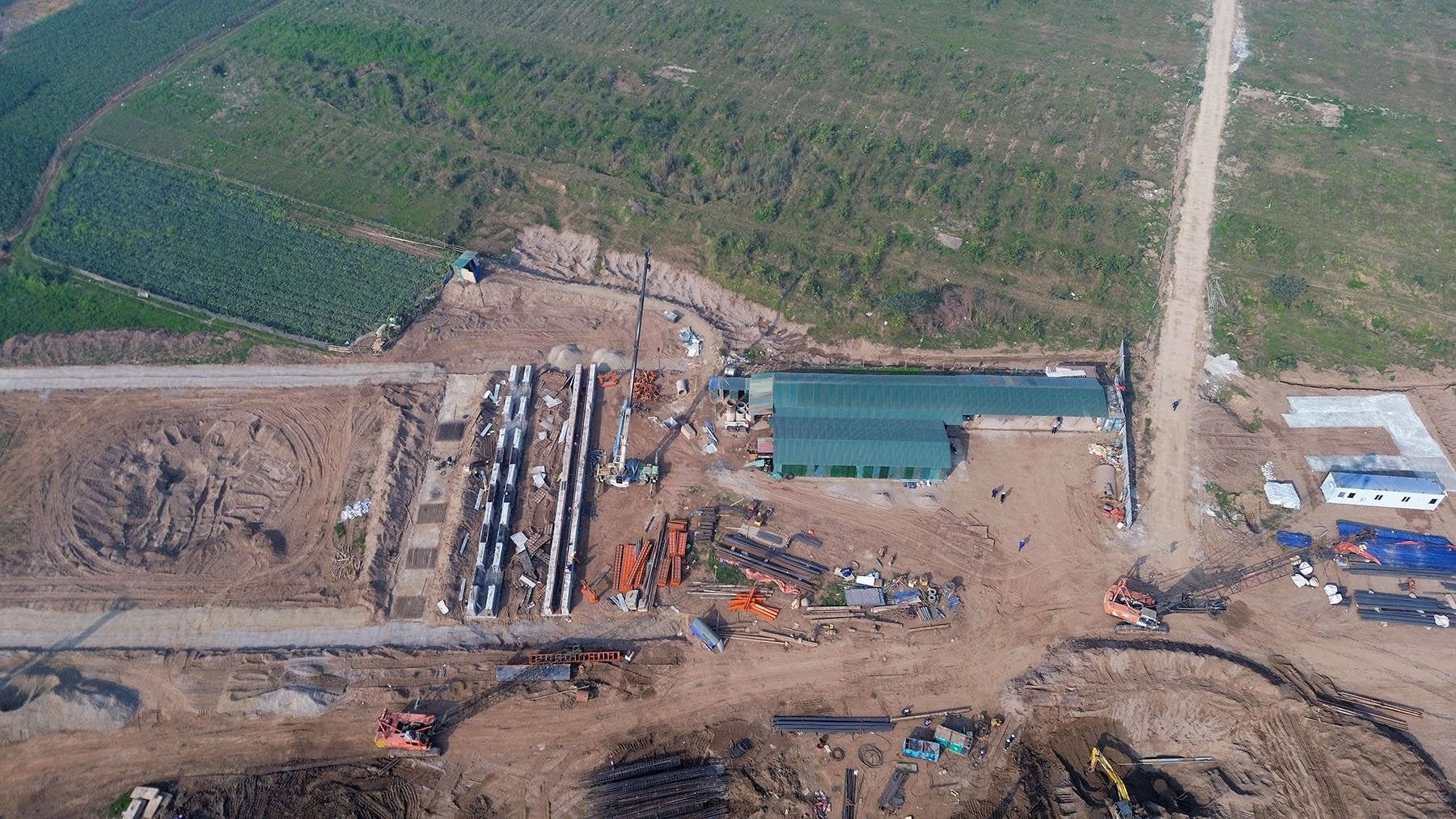 Hiện tại trên công trường đang đồng loạt thi công hạng mục cọc khoan nhồi với 15 mũi với hơn 300 công nhân, 100 cán bộ kỹ sư, cùng với 150 phương tiện thi công.