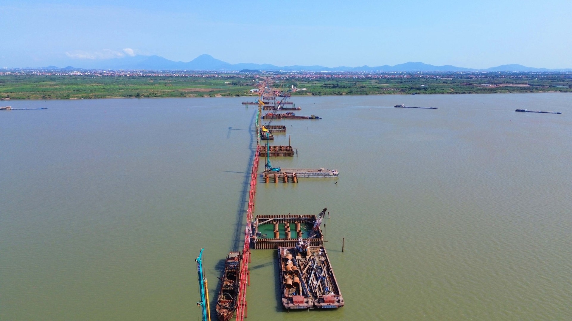 Ghi nhận của người viết vào giữa tháng 3/2026, trên công trường xây dựng cầu Hồng Hà, nhà thầu đang tích cực triển khai hạng mục khoan cọc nhồi, làm dầm thép. Hàng chục mũi thi công, với hơn 200 máy móc hiện đại, đang thi công trên tất cả các khu vực của dự án.
