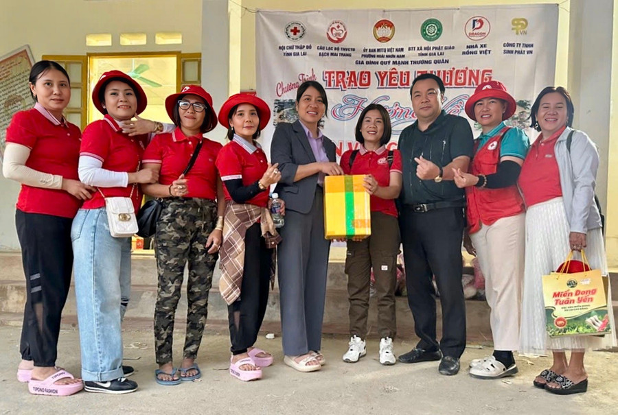 Câu lạc bộ Tình nguyện viên Chữ thập đỏ Bạch Mai Trang trao quà tại xã Nguyễn Huệ (tỉnh Cao Bằng). Ảnh: ĐVCC