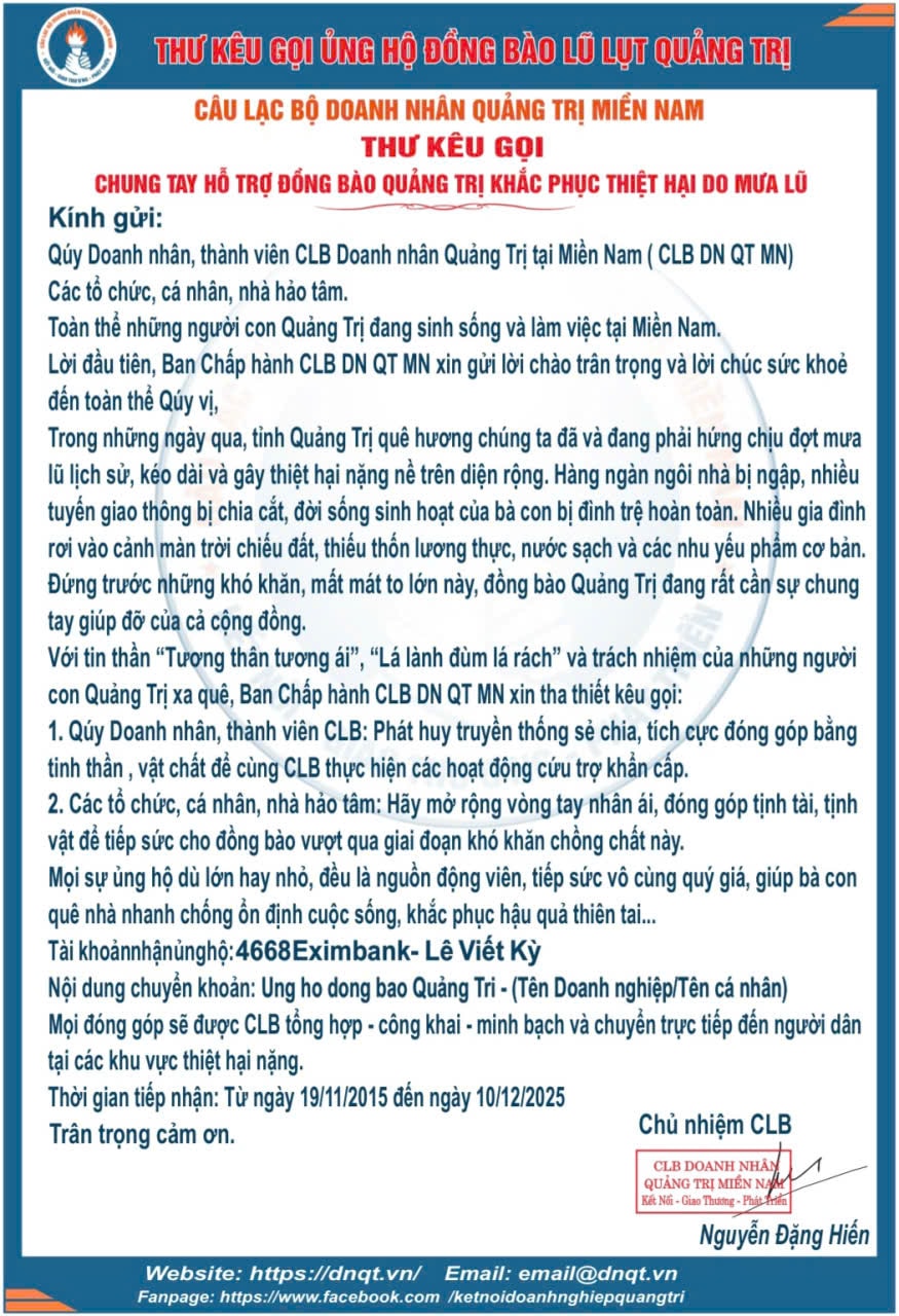 Trước tình hình đó, CLB Doanh nhân Quảng Trị miền Nam kêu gọi tinh thần “tương thân tương ái”, “lá lành đùm lá rách” trong cộng đồng doanh nhân cũng như những người con Quảng Trị đang sinh sống và làm việc tại miền Nam, tích cực đóng góp cả về tinh thần lẫn vật chất để kịp thời hỗ trợ người dân vùng lũ vượt qua giai đoạn khó khăn.