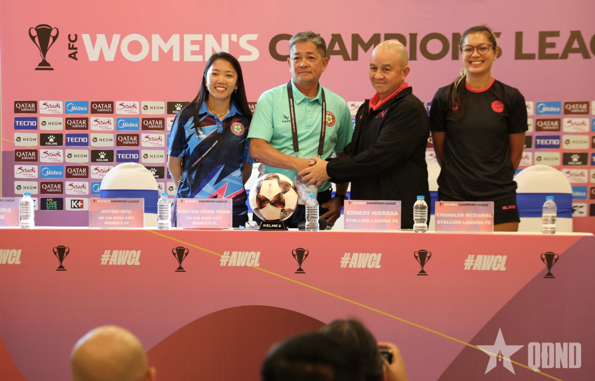 HLV trưởng CLB nữ TP Hồ Chí Minh Nguyễn Hồng Phẩm cùng đội trưởng Huỳnh Như cùng đại diên CLB Stallion Laguna (Philippines) tại buổi họp báo.