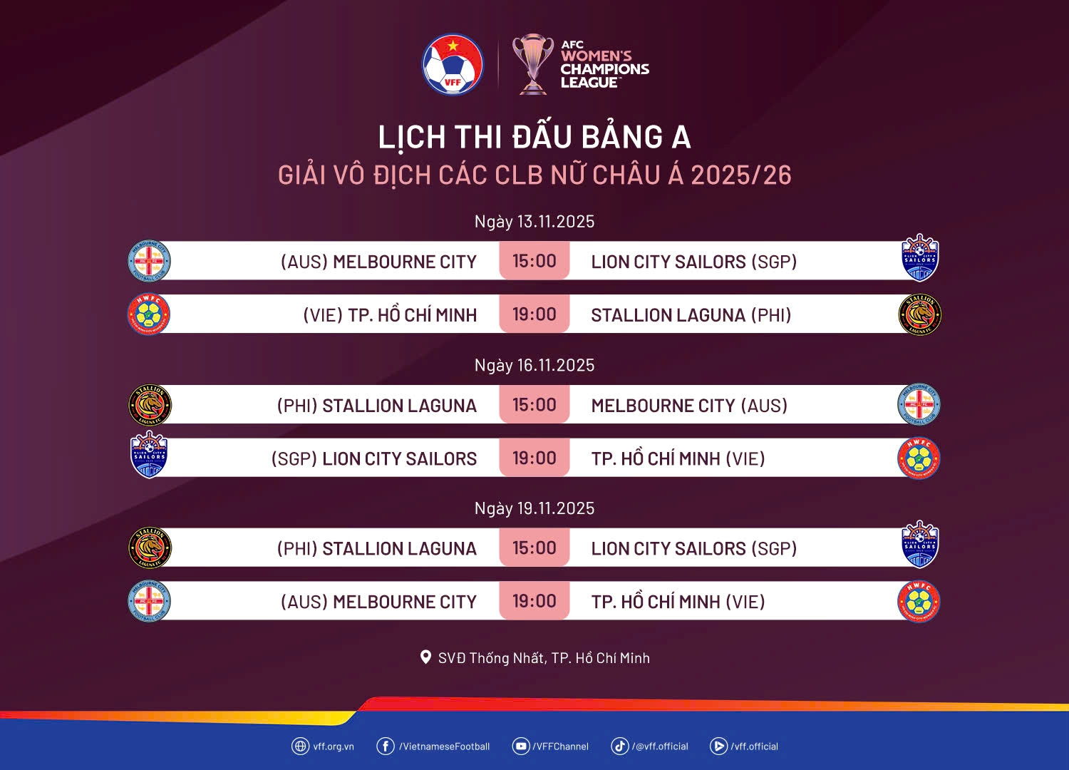 Theo lịch thi đấu bảng A, CLB nữ TP Hồ Chí Minh sẽ lần lượt gặp Stallion Laguna (Philippines) ngày 13-11, Lion City Sailors (Singapore) ngày 16-11 và Melbourne City (Australia) ngày 19-11. Tất cả các trận đều diễn ra trên sân vận động Thống Nhất, TP Hồ Chí Minh.