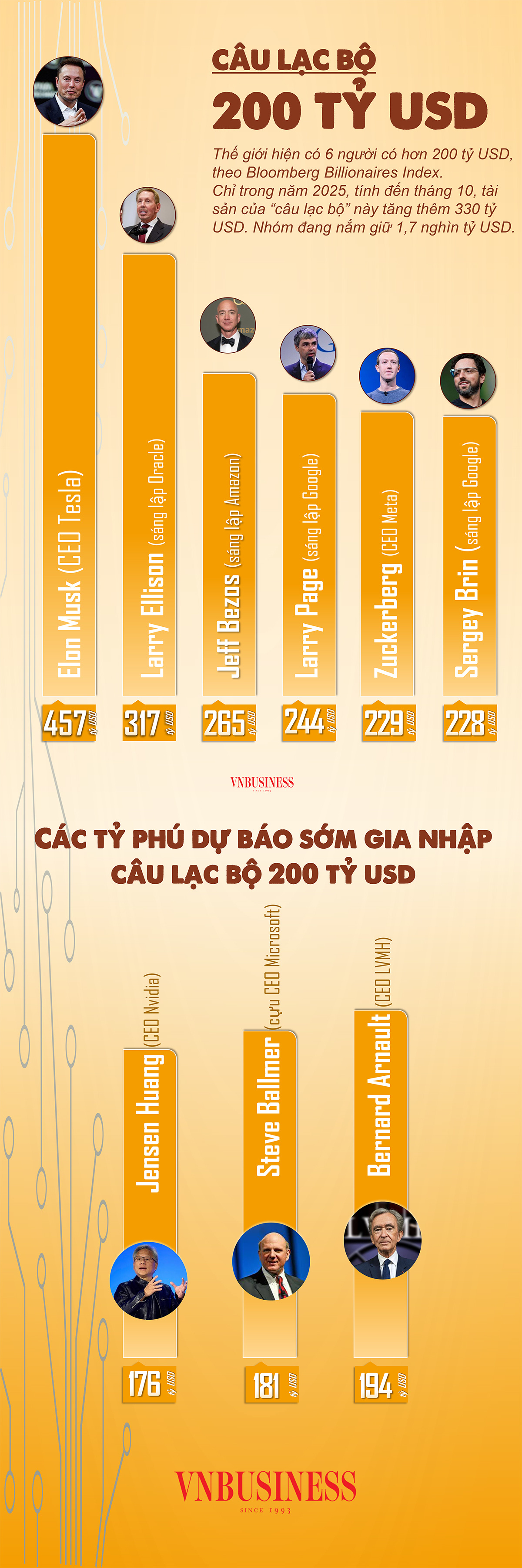 Các chuyên gia dự báo “câu lạc bộ 200 tỷ USD” sẽ còn mở rộng, với hai ứng viên tiềm năng là Jensen Huang (Nvidia) và Steve Ballmer (Microsoft), hiện sở hữu lần lượt 176 và 181 tỷ USD. Nvidia và Microsoft đều hưởng lợi lớn từ AI khi vốn hóa đạt 5.000 và hơn 4.000 tỷ USD.