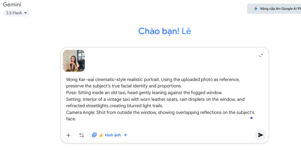 Bước 2: Tải ảnh lên và nhập câu lệnh tạo ảnh ngồi trong xe phong cách HongKong bằng Gemini như sau: