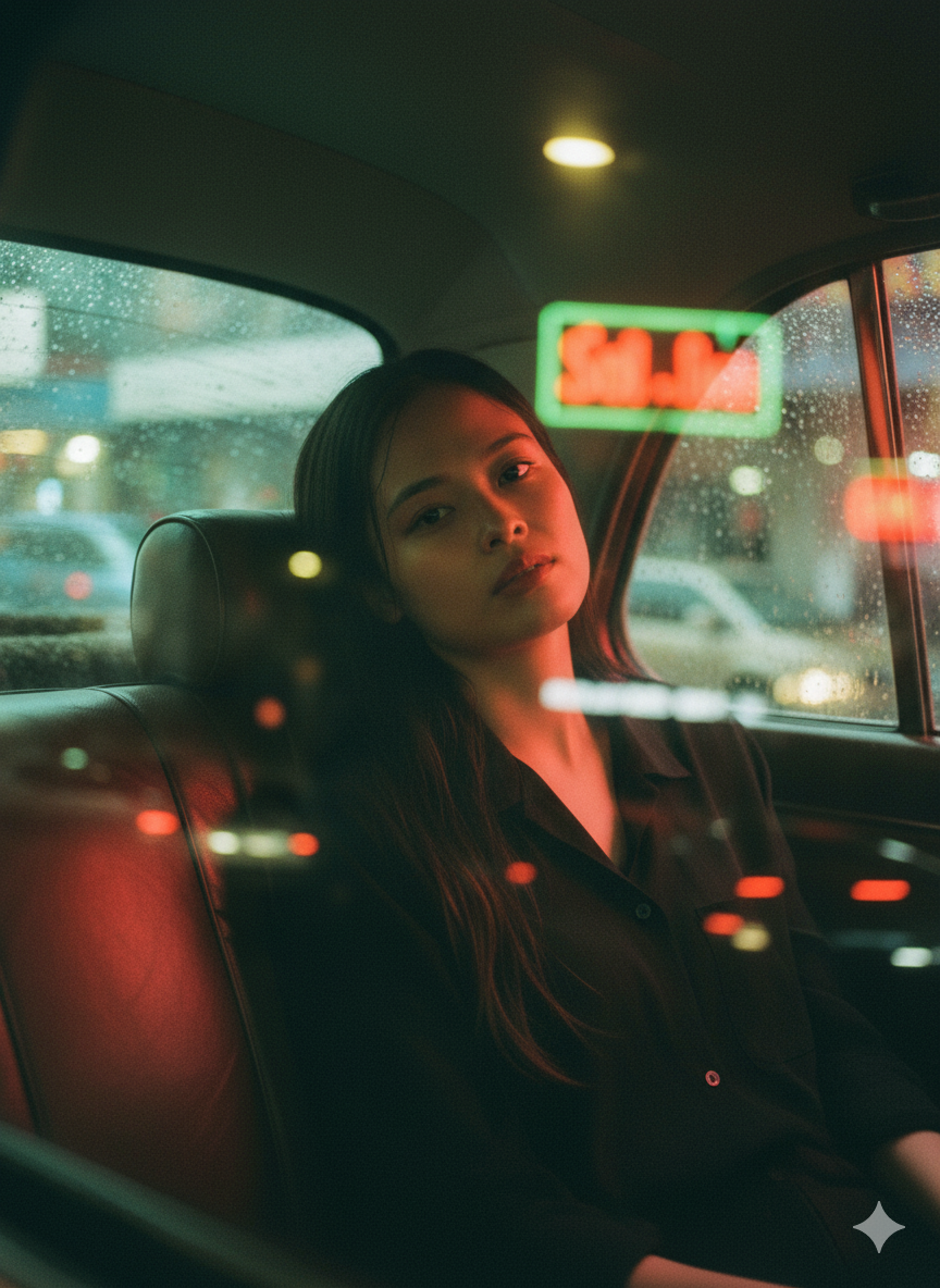 - Pose: Sitting inside an old taxi, head gently leaning against the fogged window.