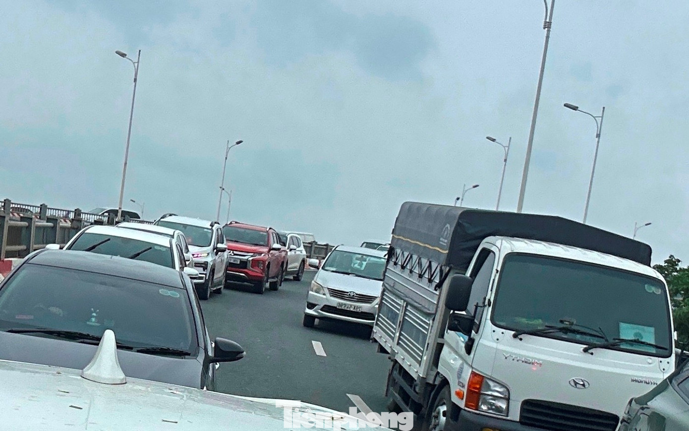 Với chiều Long Biên - trung tâm thành phố Hà Nội, xe đi trên cầu Vĩnh Tuy đã xếp hàng dài để xuống đê Nguyễn Khoái