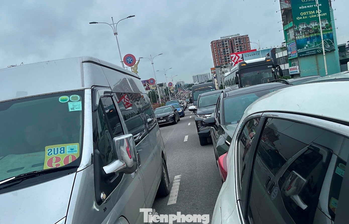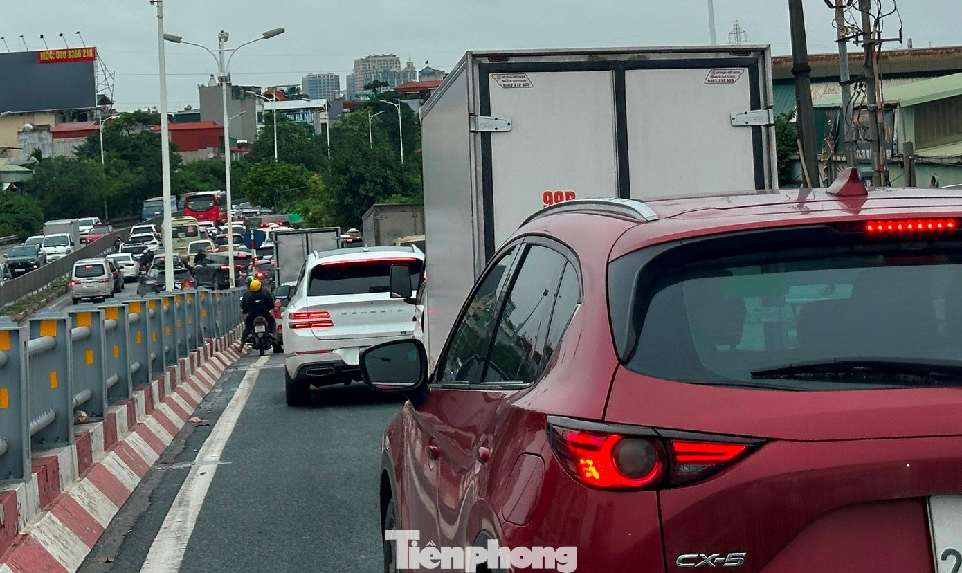 Lượng xe tăng trên cầu Vĩnh Tuy khiến các tuyến đường, nút giao hai đầu cầu cũng ùn tắc theo.
