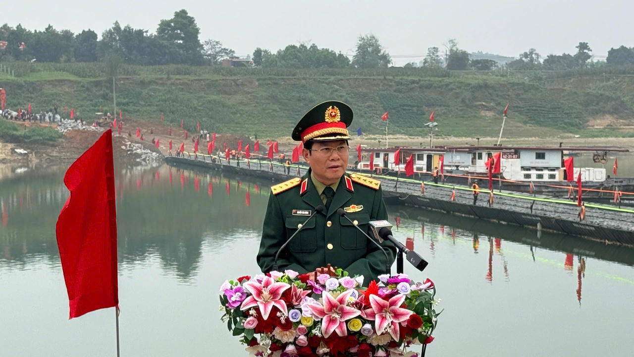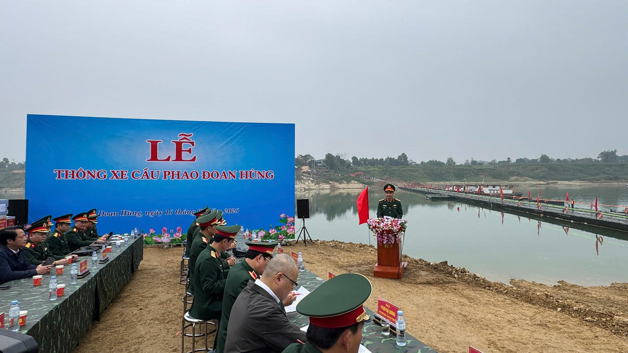 Phát biểu tại buổi lễ, thay mặt Quân ủy Trung ương và Bộ Quốc phòng, Đại tướng Nguyễn Tân Cương biểu dương tinh thần trách nhiệm, sự tận tụy và những đóng góp của cán bộ, chiến sĩ và các lực lượng tham gia nhiệm vụ bắc cầu phao Đoan Hùng. Đại tướng khẳng định, đây không chỉ là công trình giao thông có ý nghĩa cấp thiết mà còn là biểu tượng sinh động của tinh thần trách nhiệm và nghĩa tình quân dân bền chặt.