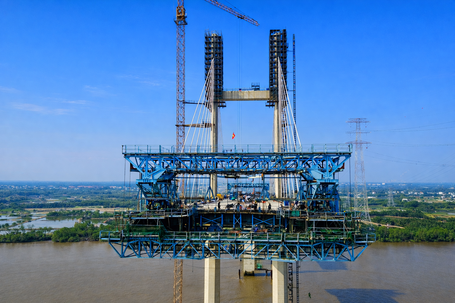 Ghi nhận tại công trường những ngày giáp Tết, các mũi thi công được tổ chức liên tục trên cả hai trụ chính của cầu dây văng. Tiếng máy móc, cần cẩu, thiết bị nâng hạ vang lên liên tục. Trên cao, từng bó cáp dây văng được lắp đặt chính xác theo trình tự kỹ thuật nghiêm ngặt; dưới thấp, các hạng mục cầu dẫn và kết cấu phụ trợ được triển khai đồng bộ.