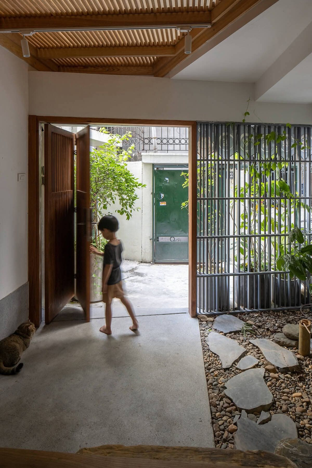 Bắt đầu từ tầng trệt với phần sàn lót sỏi và đá cùng cây xanh, dẫn lên trục cầu thang gỗ và sắt tới sân thượng.