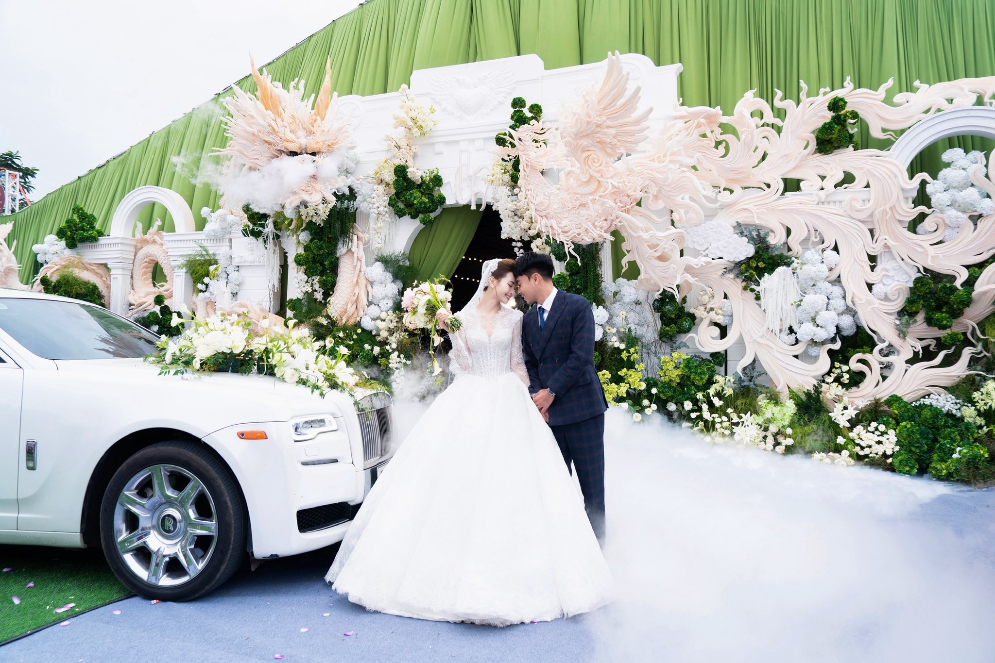 Trong ngày trọng đại, cô dâu Huyền Trang diện váy cưới dáng công chúa với phần tùng váy xòe rộng, được đính ren tinh xảo. Chú rể Đức Huy lựa chọn vest xanh đậm, kết hợp áo sơ mi trắng và cà vạt tối màu. Đáng chú ý, nam cầu thủ sử dụng chiếc Rolls-Royce màu trắng làm xe đón dâu, thu hút nhiều sự quan tâm.