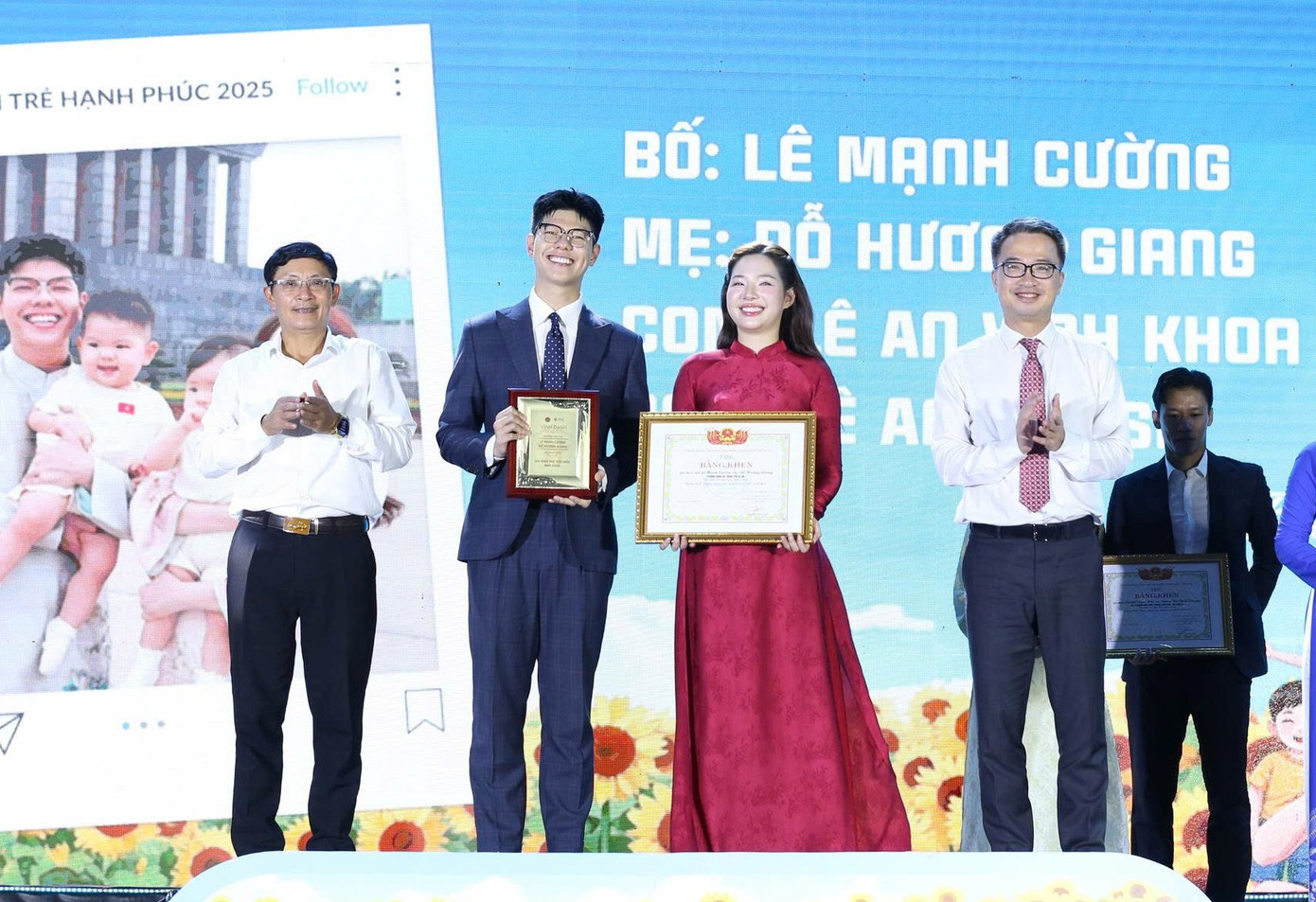 Bí thư T.Ư Đoàn, Chủ tịch T.Ư Hội LHTN Việt Nam Nguyễn Tường Lâm trao Bằng khen tặng vợ chồng MC Lê Mạnh Cường và Đỗ Hương Giang.