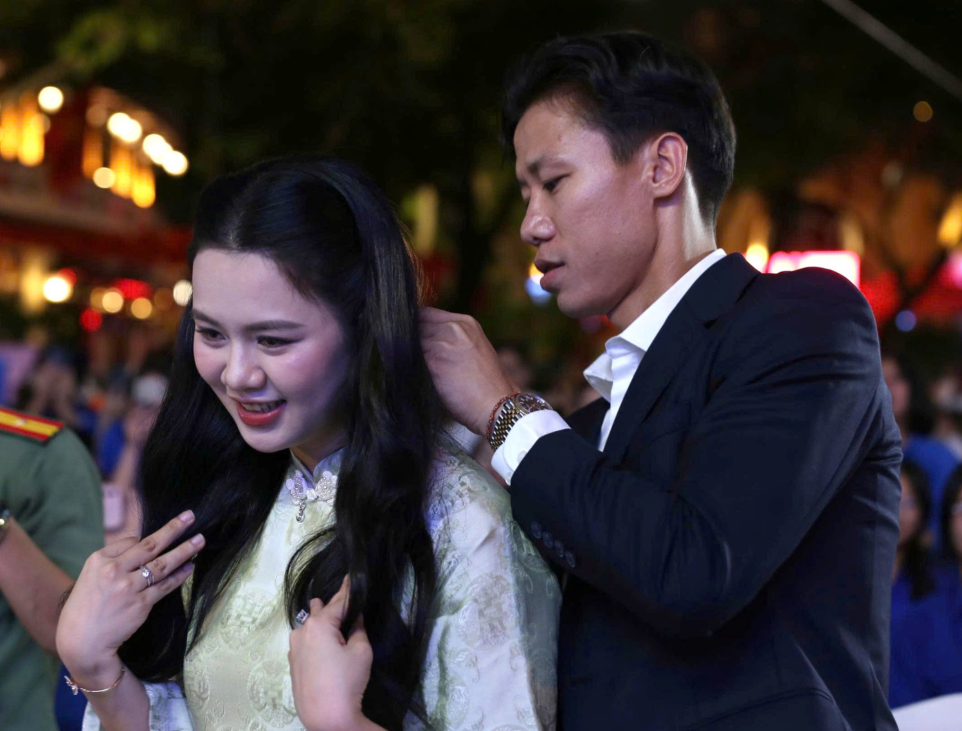 Cầu thủ Quế Ngọc Hải trao tặng vợ Dương Thị Thùy Phương món quà yêu thương. Ảnh: Lâm Đăng Hải