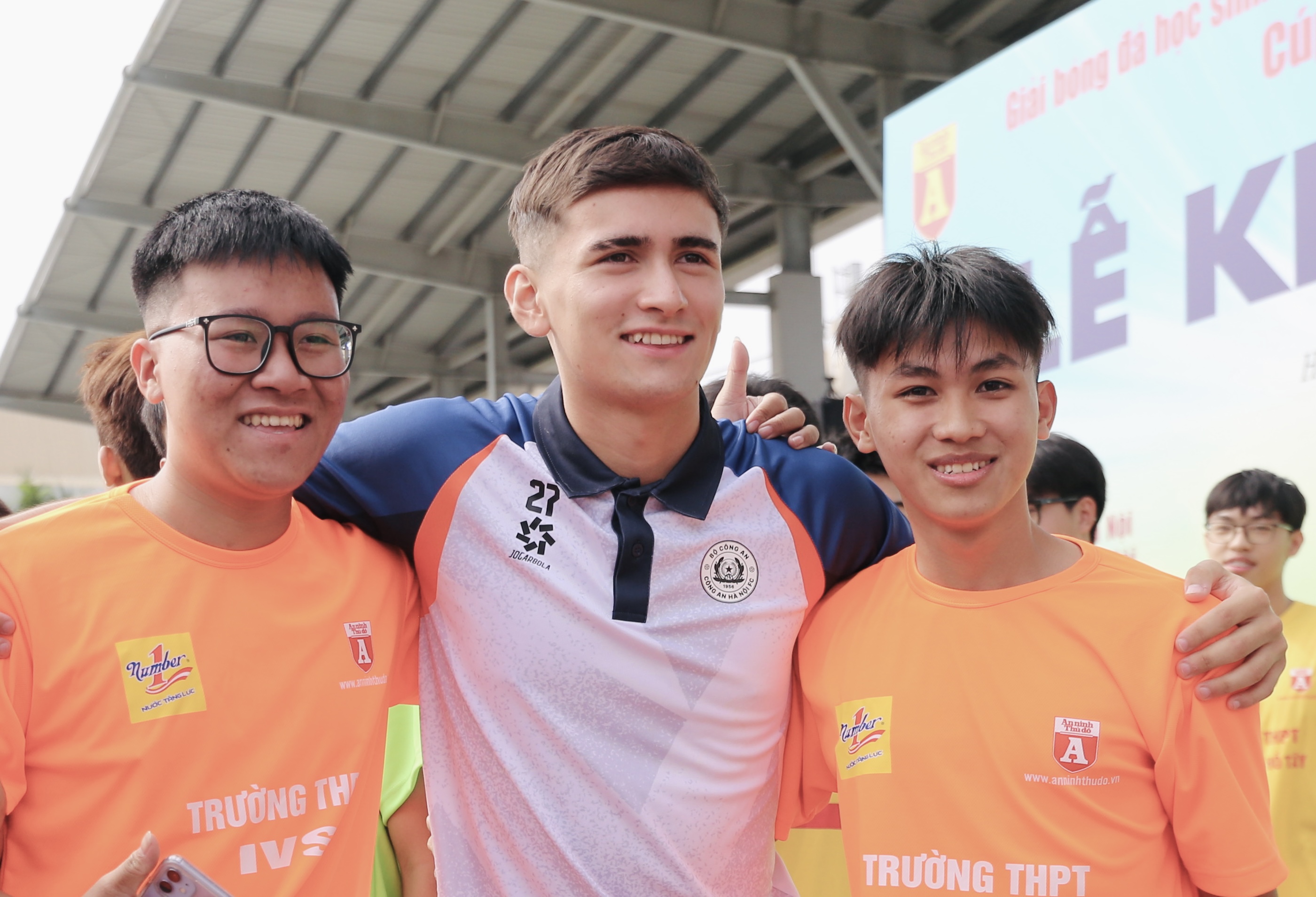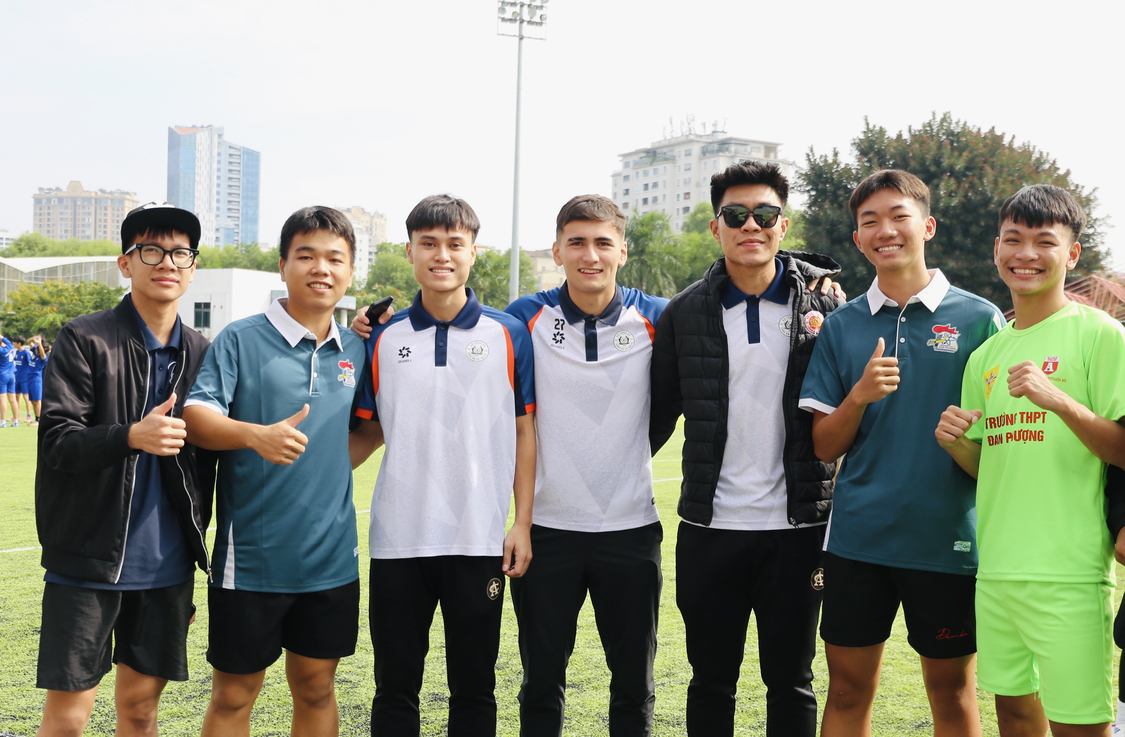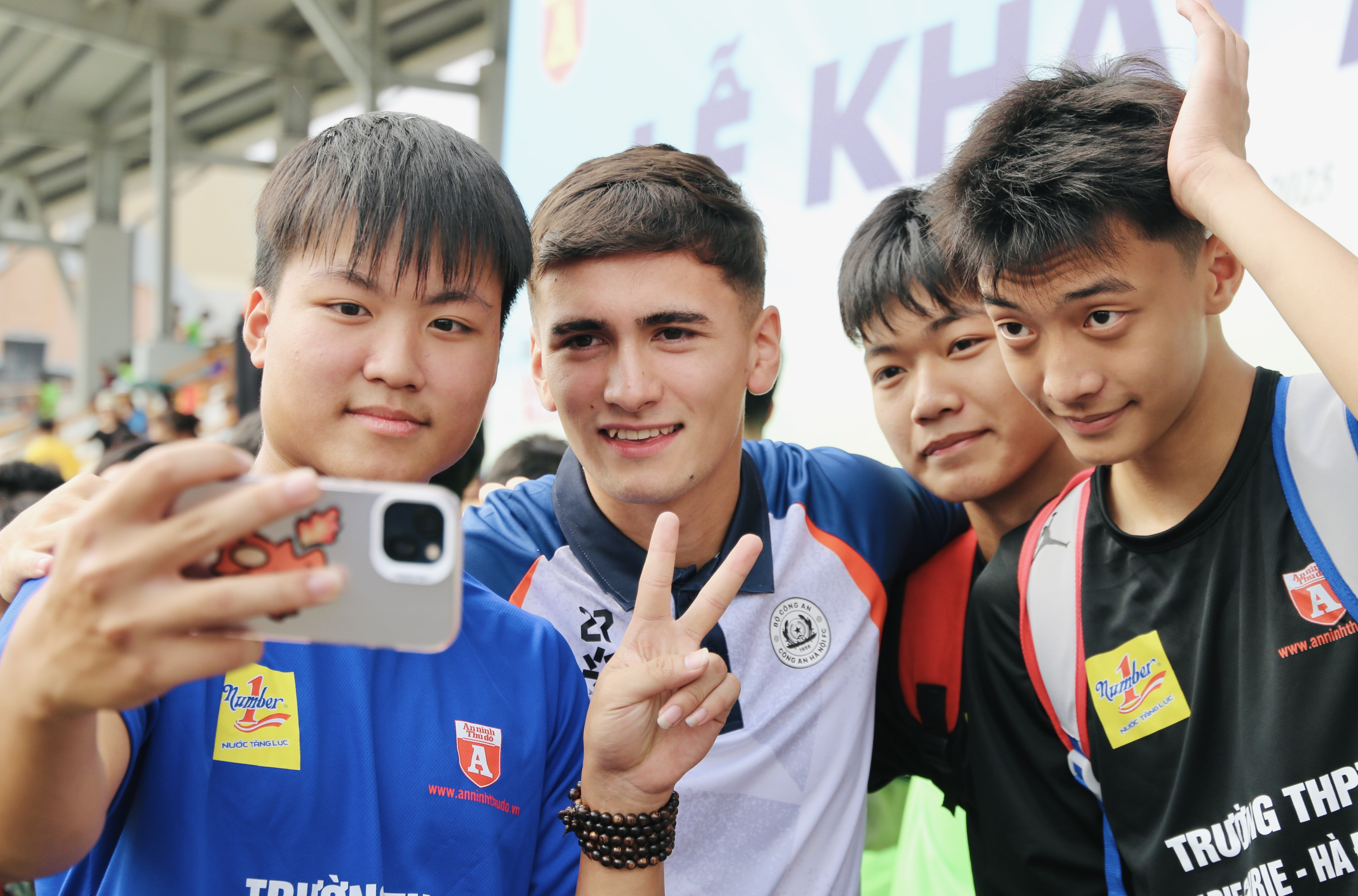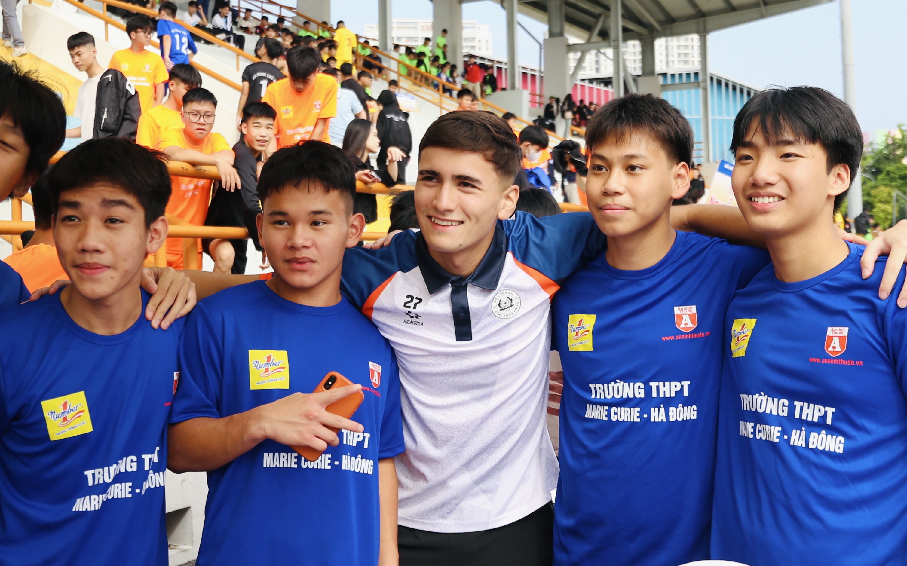 Tiền vệ Việt kiều Anh vui vẻ chụp ảnh cùng các cầu thủ giải bóng đá học sinh THPT Hà Nội 2025