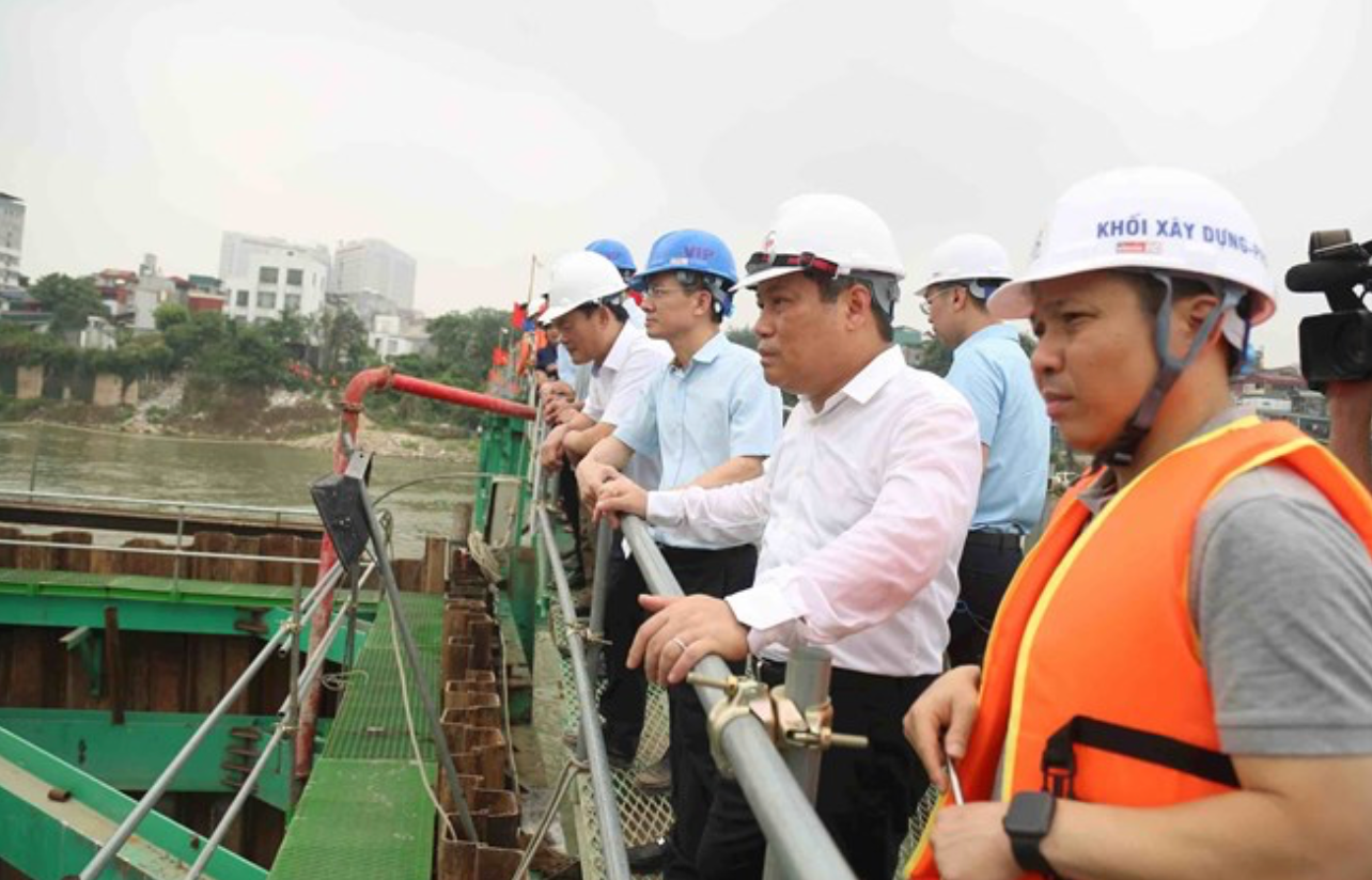 Chủ tịch UBND TP Hà Nội Vũ Đại Thắng kiểm tra tiến độ xây dựng cầu Trần Hưng Đạo. Ảnh: Phạm Công