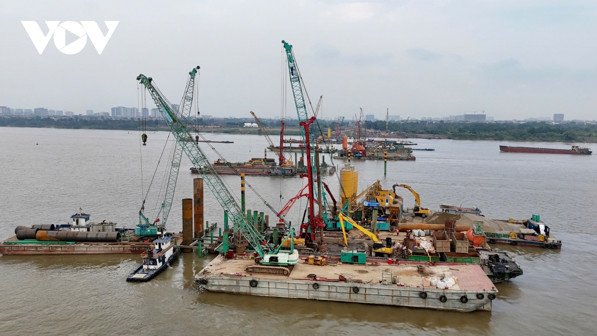 Các trụ chính đã hoàn thành cọc khoan nhồi và đang chuyển sang giai đoạn thi công cọc ván thép.