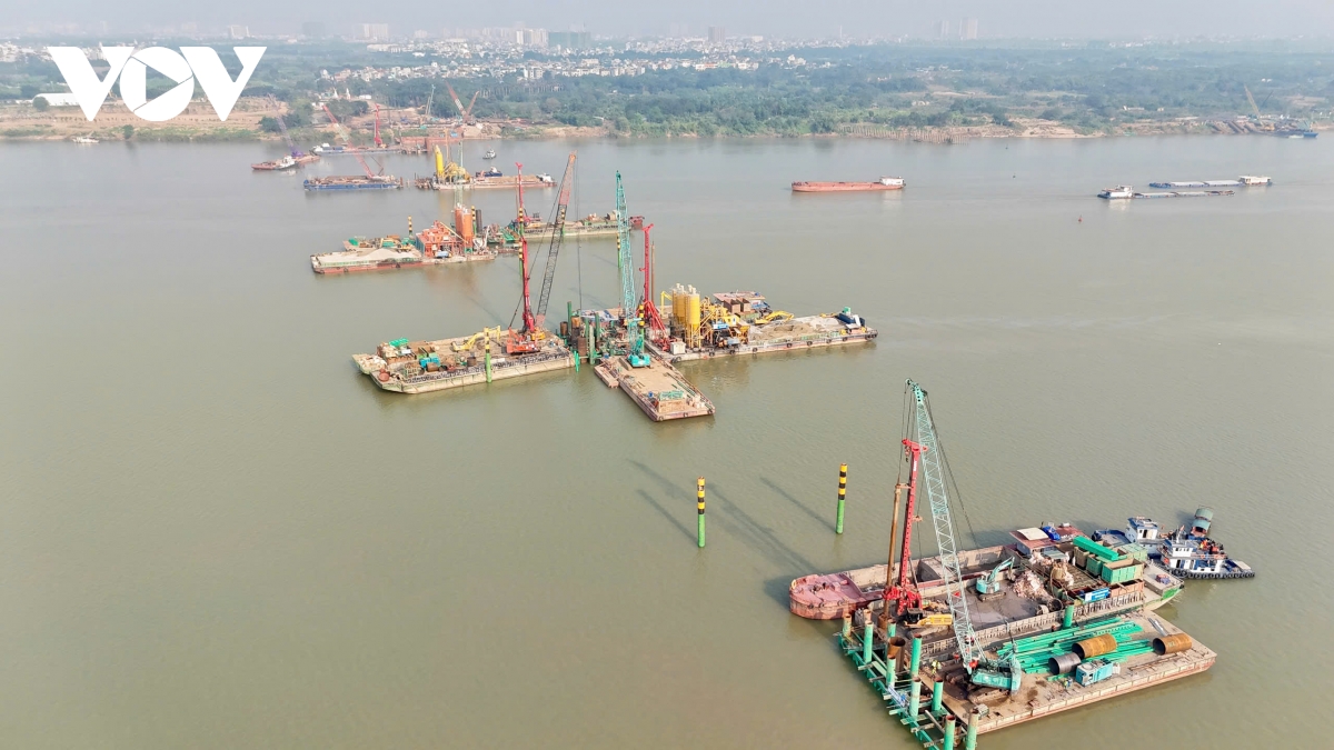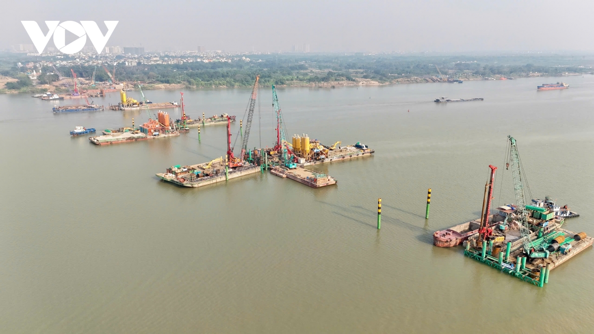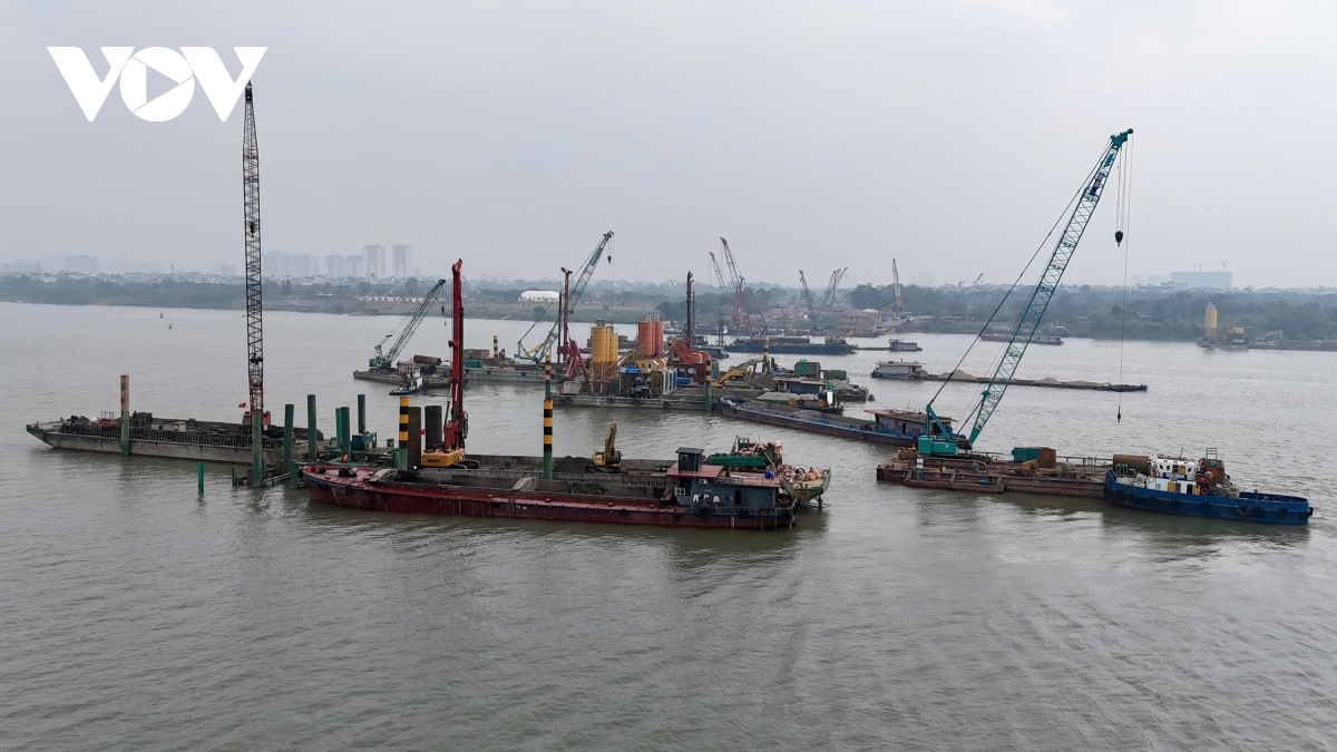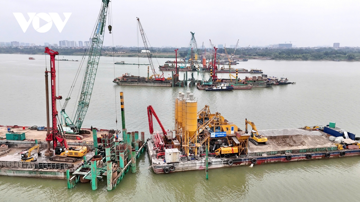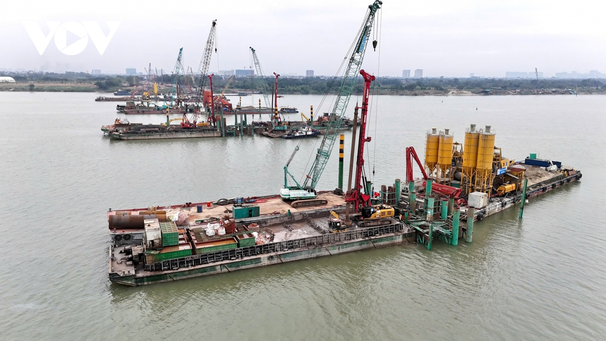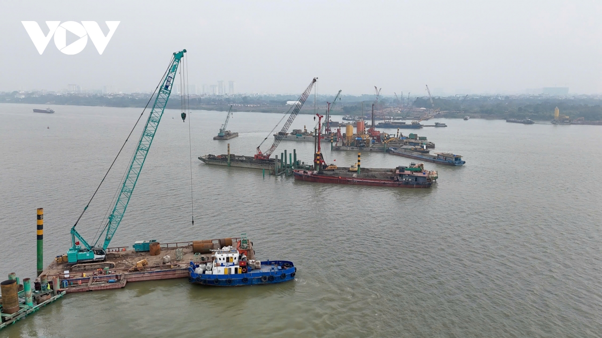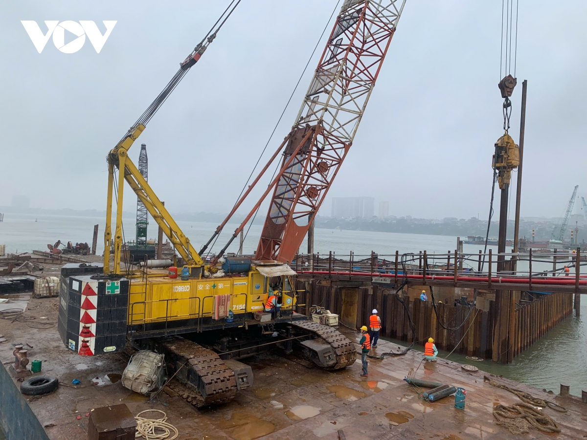 Hiện đồng loạt 10 mũi thi công, trong đó 6 mũi thi công các trụ cầu chính và 4 mũi thi công đường dẫn phía Long Biên.