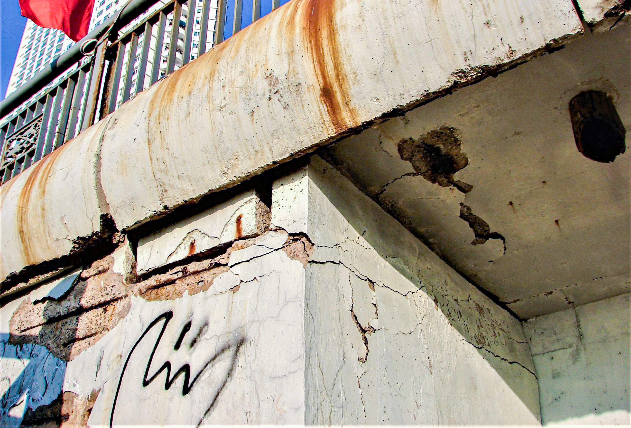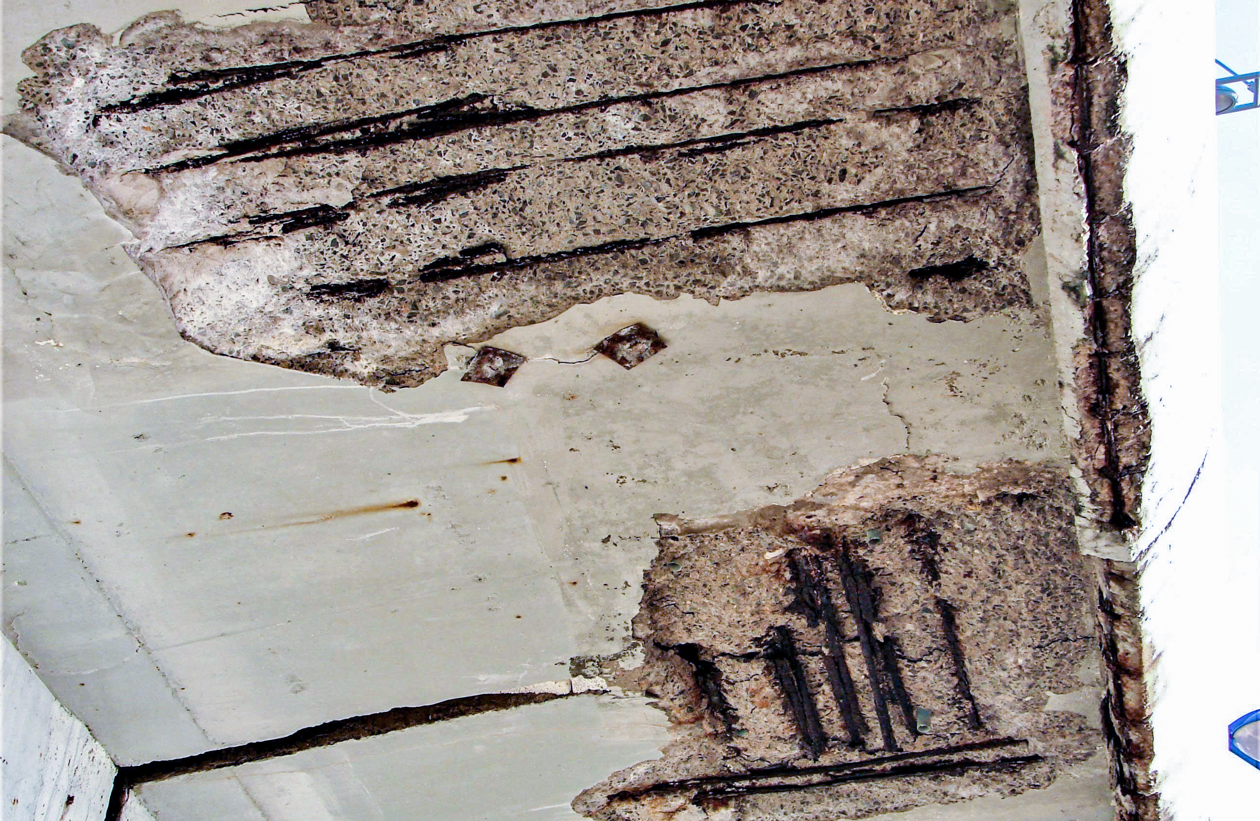 Nhiều mảng bê tông bong tróc lộ sắt thép bị hoen rỉ. Ảnh: CÔNG THI