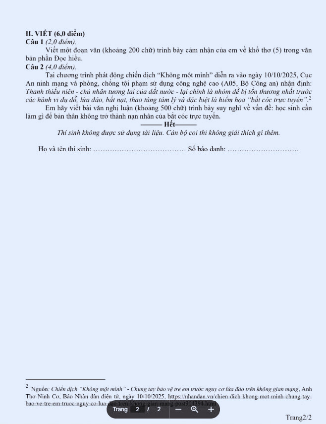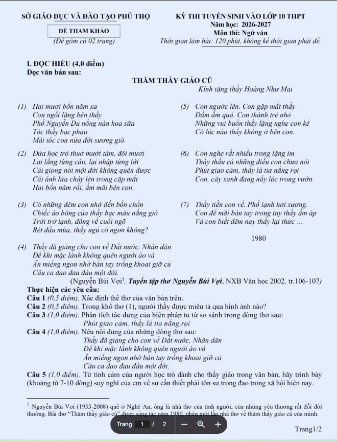 Đề tham khảo môn Ngữ văn kỳ thi tuyển sinh vào lớp 10 trung học phổ thông năm học 2026-2027 của tỉnh Phú Thọ. Nguồn: Sở Giáo dục và Đào tạo tỉnh Phú Thọ