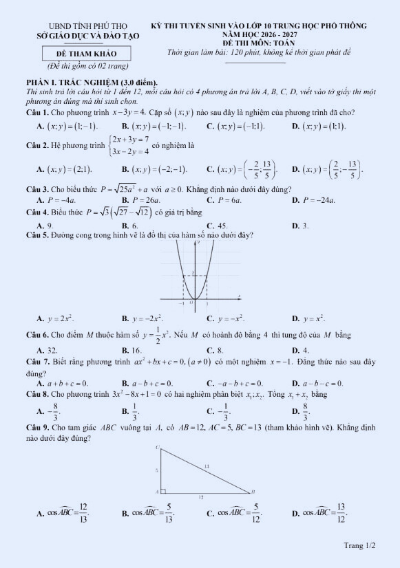 Đề tham khảo môn Toán kỳ thi tuyển sinh vào lớp 10 trung học phổ thông năm học 2026-2027 của tỉnh Phú Thọ. Nguồn: Sở Giáo dục và Đào tạo tỉnh Phú Thọ