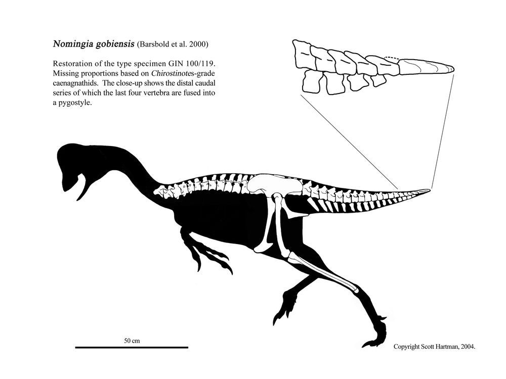 Sở hữu cấu trúc đuôi cực kỳ đặc biệt. Phần đuôi của Nomingia có các đốt sống hợp nhất thành dạng pygostyle, tương tự cấu trúc đuôi ở chim ngày nay, gợi ý sự hiện diện của chùm lông đuôi phát triển. Ảnh: Pinterest.