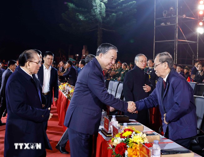 Tổng Bí thư Tô Lâm, các đồng chí lãnh đạo, nguyên lãnh đạo Đảng, Nhà nước dự Chương trình kỷ niệm 85 năm Ngày Bác Hồ về nước Trực tiếp Lãnh đạo Cách mạng Việt Nam (28/1/1941-28/1/2026) “Hai tay xây dựng một sơn hà” tại Cao Bằng. (Ảnh: Thống Nhất/TTXVN)