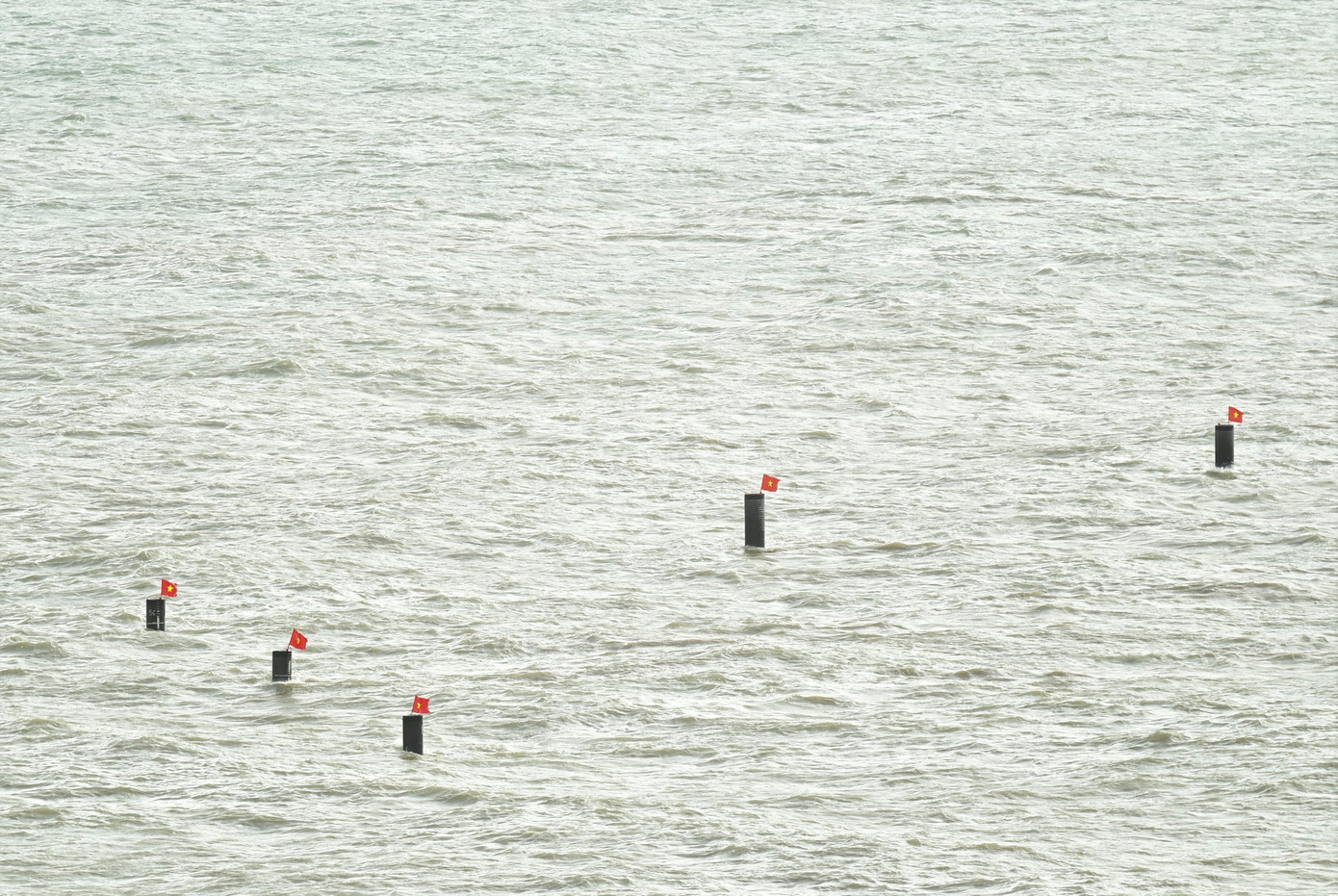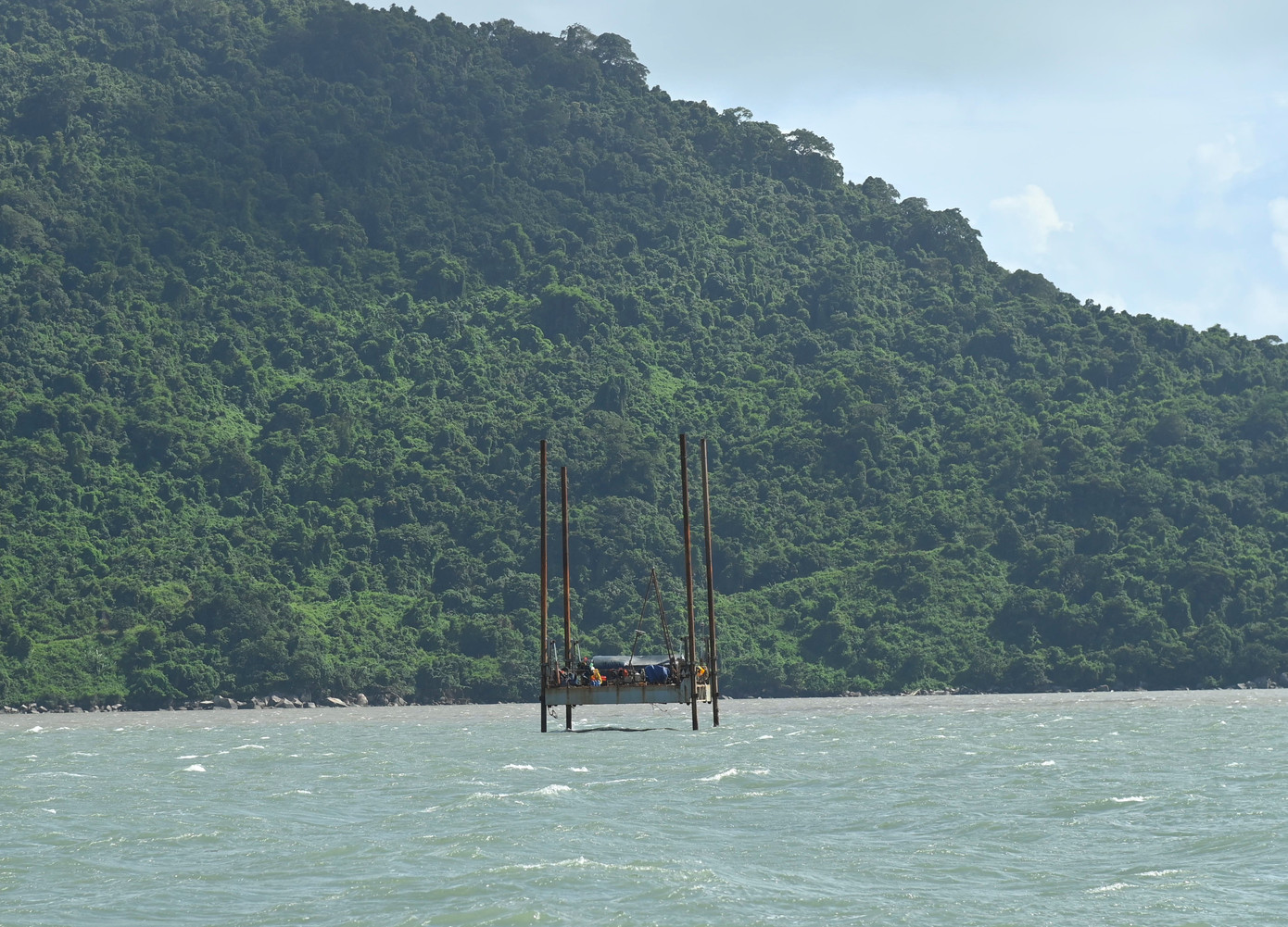 Đơn vị thi công đóng các cọc tạm thăm dò địa chất, định vị luồng tuyến xây cầu vượt biển từ bờ ra đảo Hòn Khoai.