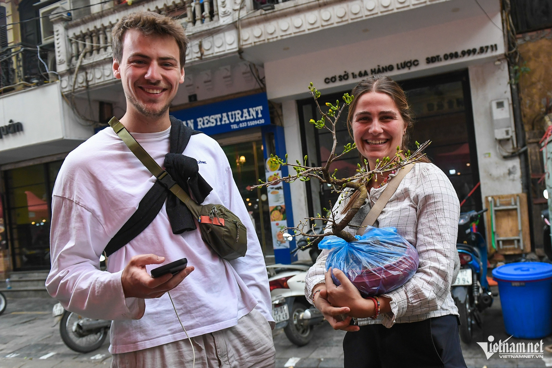 Victoria (du khách đến từ Anh) cho biết, sẽ ở lại Việt Nam vào dịp Tết Nguyên đán. "Tôi rất vui khi được đi mua cây cảnh để tận hưởng không khí đón năm mới cùng mọi người. Chậu hoa mai này tôi mua với giá 450.000 đồng. Người bán hàng rất vui tính, anh ấy đã giảm giá cho chúng tôi".