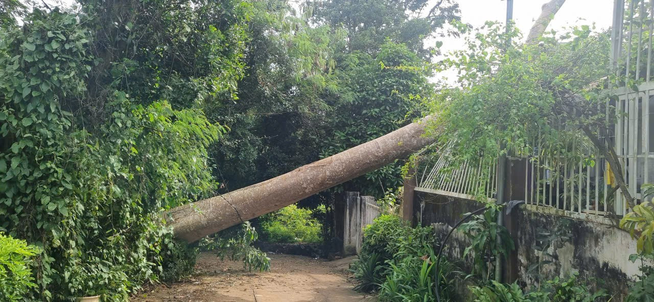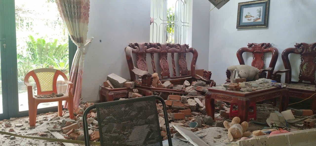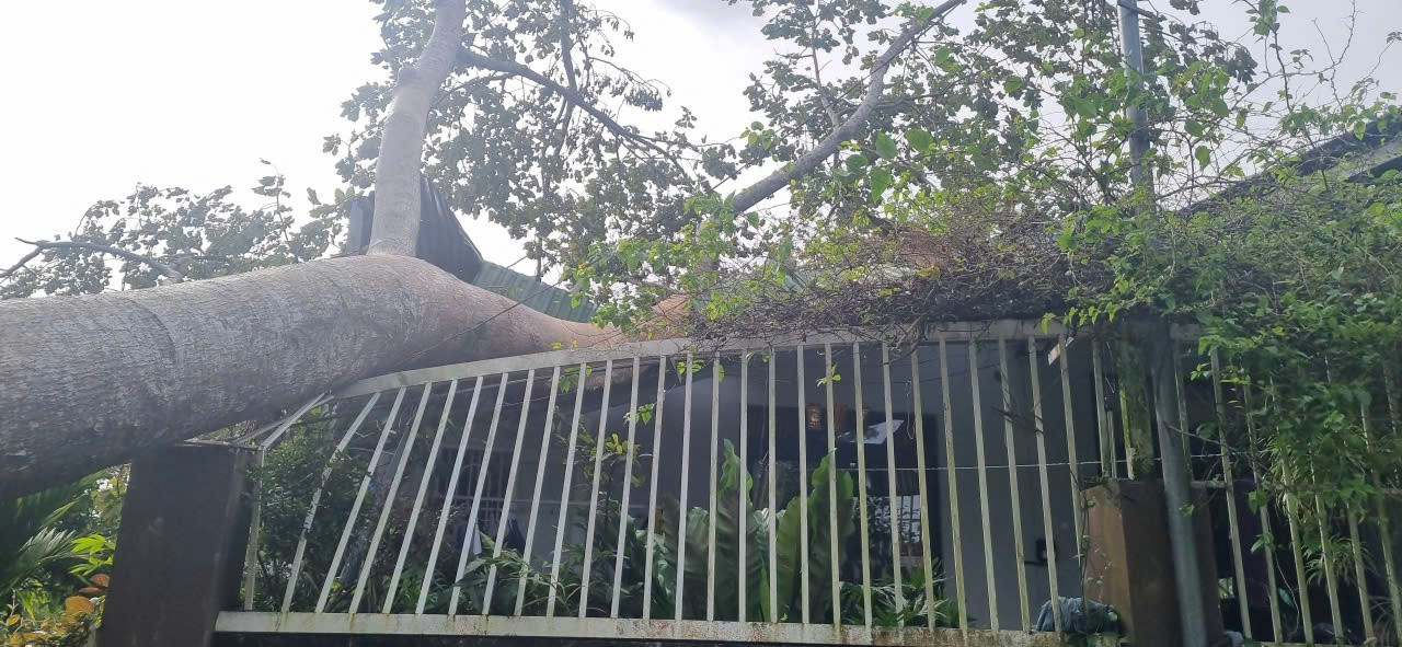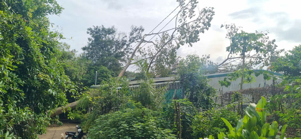 Trước đó, khoảng 8h30 cùng ngày, một cây Tung cổ thụ có đường kính khoảng 2m, cao khoảng 40m bất ngờ bật gốc, đổ sang phía bên kia đường. Cây đè sập toàn bộ phần mái và làm hư hỏng nghiêm trọng phòng khách nhà ông Lưu Triều An, trú phường Buôn Ma Thuột.