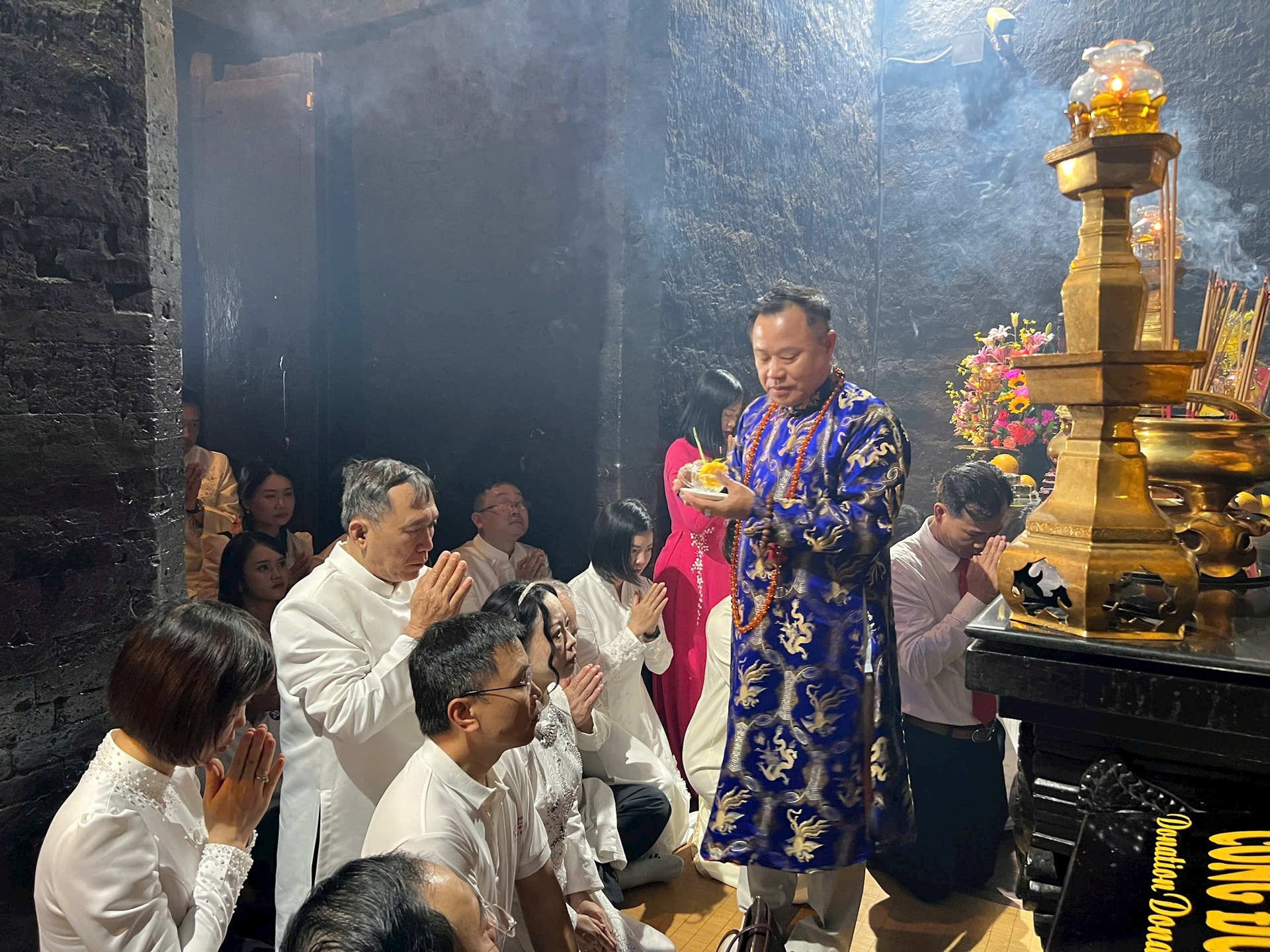 Ông Lê Văn Hoa, Phó Giám đốc Sở Văn hóa, Thể thao và Du lịch (tỉnh Khánh Hòa) với nghi lễ chúc phúc cho du khách trong lòng Tháp bà Ponagar. Ảnh: Bảo Hân