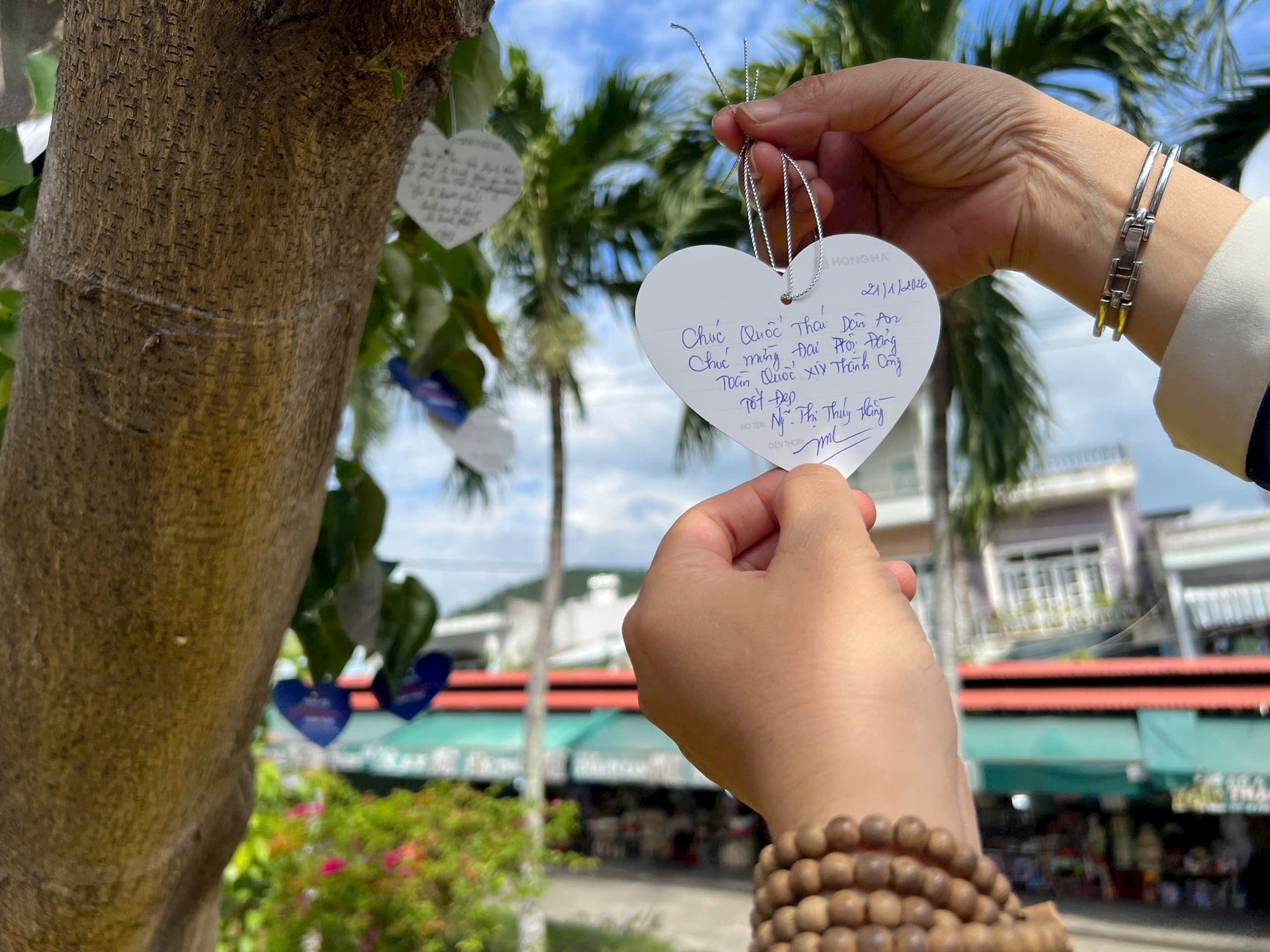 “Ngay khi cây hạnh phúc được trồng tại Tháp bà Ponagar, hàng nghìn du khách đã mong muốn bày tỏ lời chúc với hình thức viết lên lời nguyện cầu treo lên cây. Thật xúc động khi hầu hết lời chúc đều mong về "quốc thái dân an” và “chúc mừng Đại hội Đảng toàn quốc lần thứ XIV đang diễn ra thành công tốt đẹp” đem lại sinh kế cho nhân dân, mở ra vận hội lớn cho đất nước phát triển”, bà Hằng cho biết.