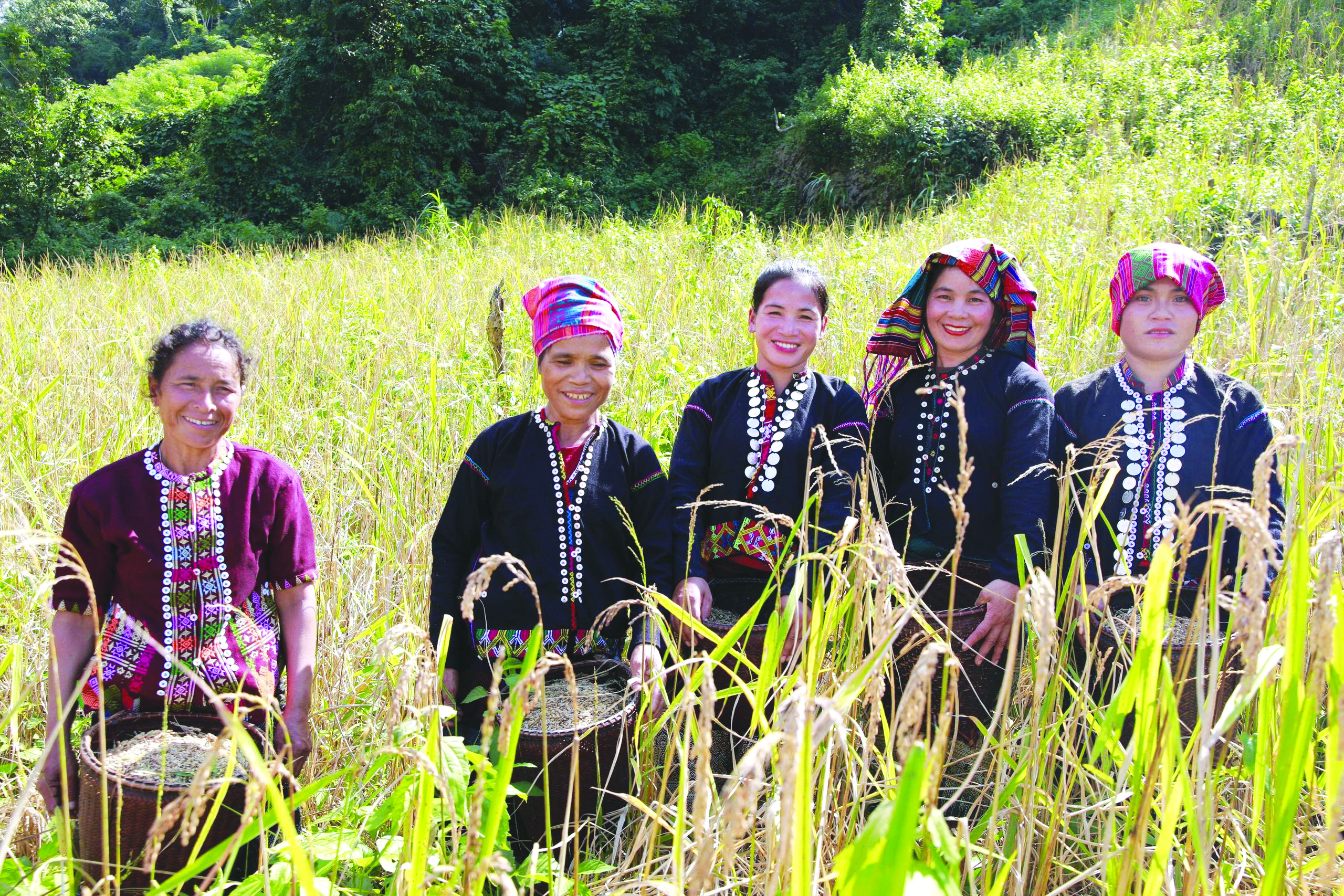 Phụ nữ Vân Kiều tham gia tuốt lúa trong lễ Piếc xa rò - Ảnh: P.T.Lâm
