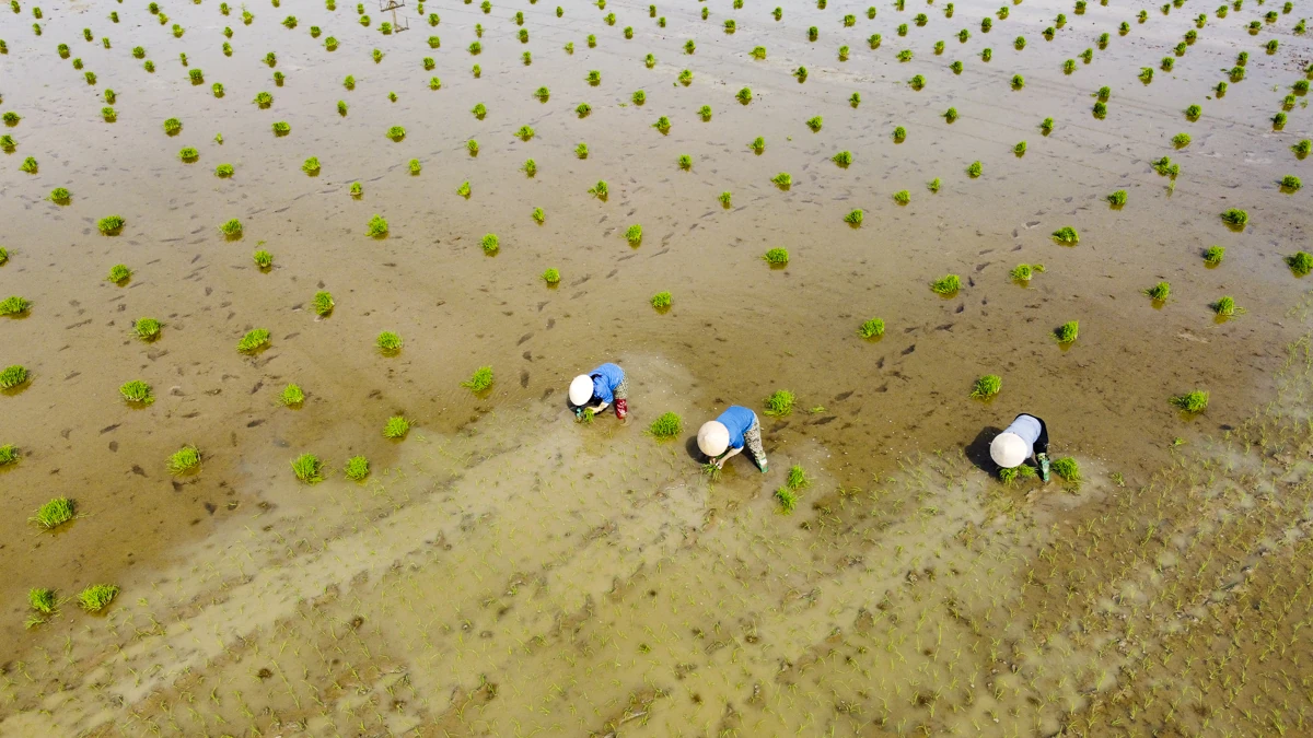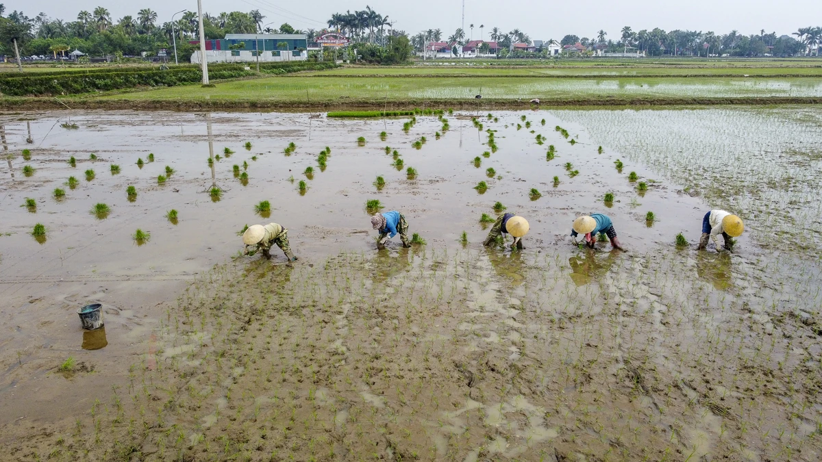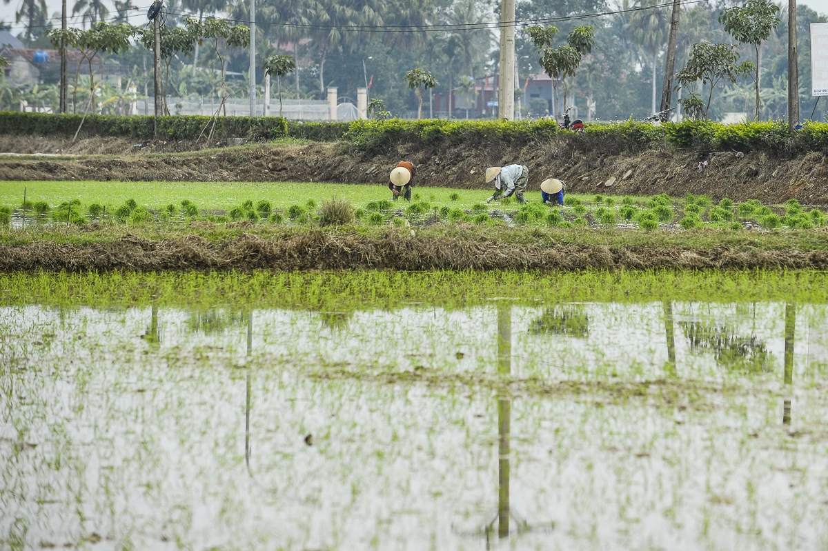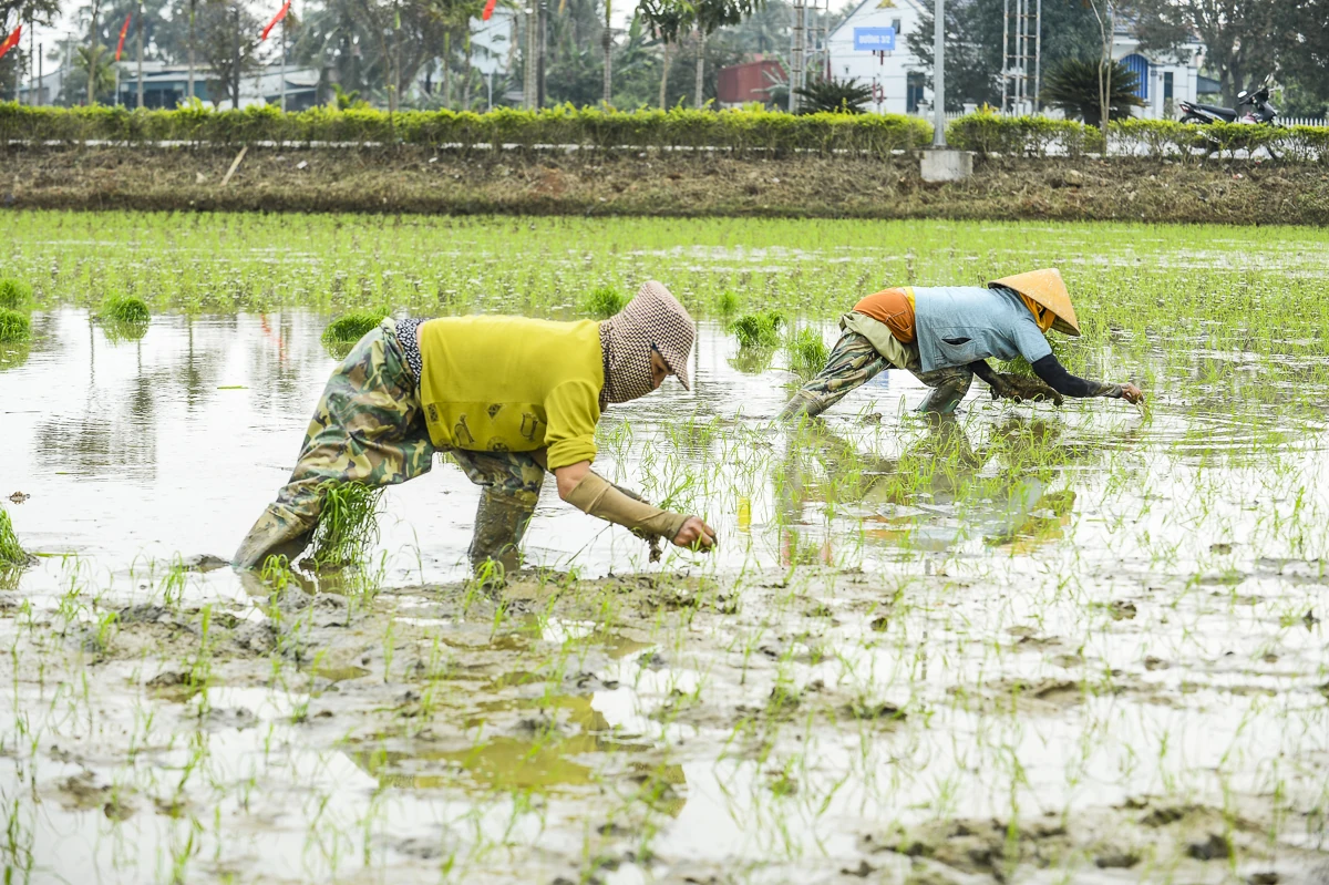 Những ngày giáp Tết, ghi nhận tại cánh đồng xã Trường Văn (Thanh Hóa), không khí lao động diễn ra khẩn trương. Nhiều hộ có diện tích ruộng lớn chủ động thuê thêm nhân công để kịp tiến độ gieo cấy, bảo đảm khung thời vụ. Trên ruộng, từng tốp thợ cấy thoăn thoắt đôi tay điêu luyện, thuần thục cắm mạ.