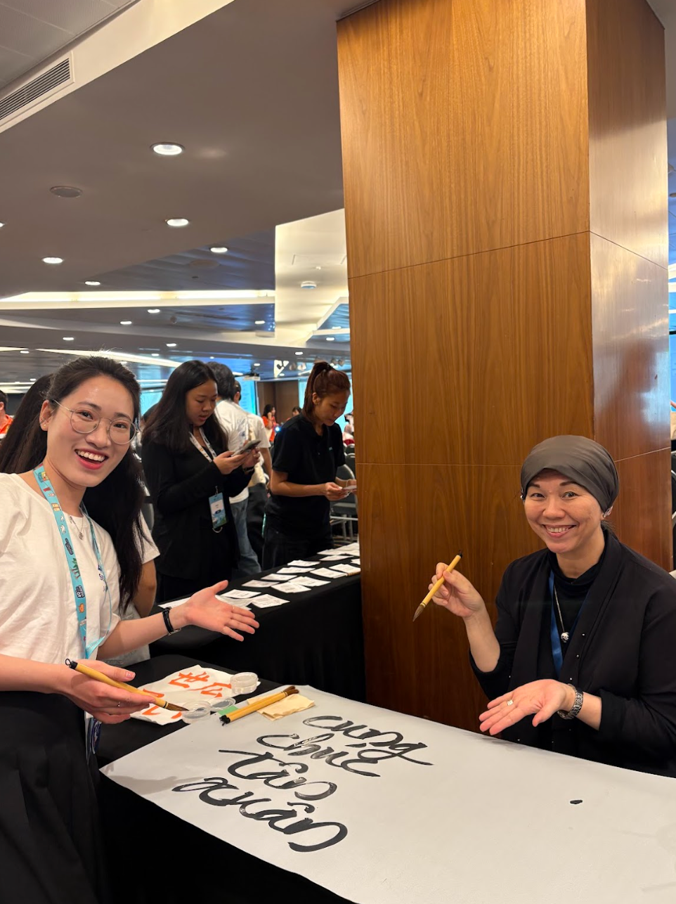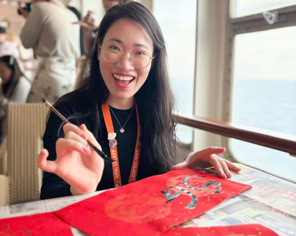 Một trong những dấu ấn rực rỡ nhất trong hành trình của Tạ Gia Hân chính là việc mang thư pháp chữ Việt lên Tàu Thanh niên Đông Nam Á – Nhật Bản (SSEAYP).