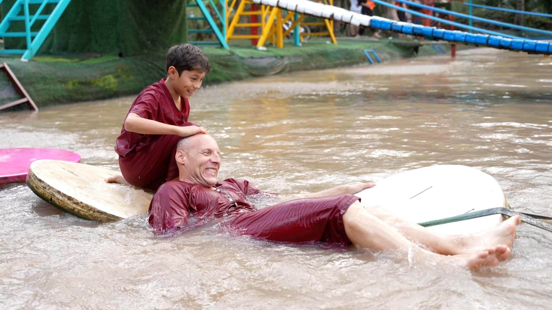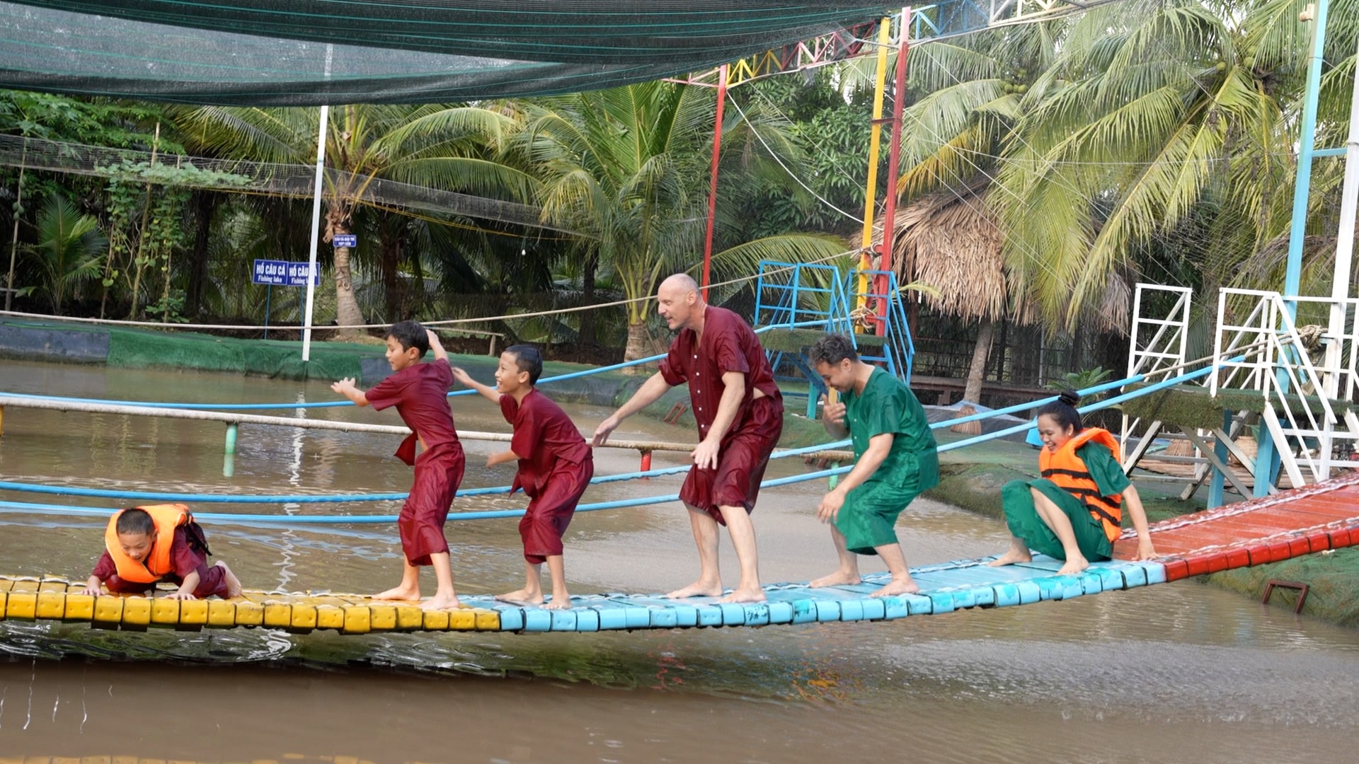 Với tinh thần chủ động khám phá, anh Andrej đã cùng bé Aaron và bé Công Minh tham gia chuỗi hoạt động trải nghiệm đặc trưng của vùng sông nước. Tại đây, nhóm đã trực tiếp trải nghiệm không gian văn hóa địa phương, từ việc tham quan cảnh quan đến tham gia các trò chơi vận động tập thể.