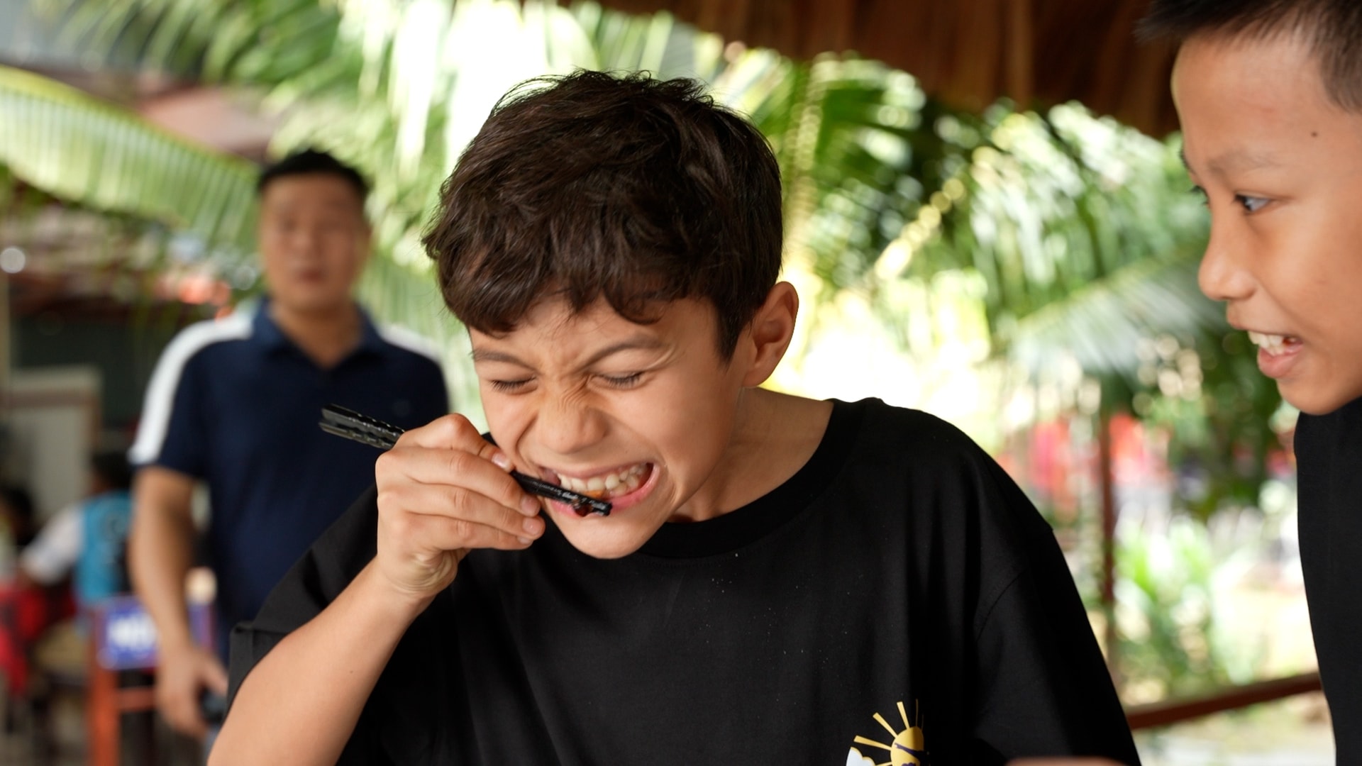 Một trong những điểm nhấn thử thách nhất của chuyến đi chính là việc thưởng thức đặc sản đuông dừa. Dù ban đầu có phần e ngại, anh Andrej đã vui vẻ chấp nhận thử thách và đánh giá món ăn này có hương vị khá thú vị. Bé Aaron cũng bày tỏ sự ấn tượng mạnh mẽ với ẩm thực địa phương, từ độ tươi ngon đến cách bài trí món ăn tỉ mỉ.