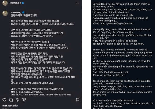 Dù vậy, anh thừa nhận việc thời điểm nhập ngũ trùng với giai đoạn điều tra có thể gây hiểu lầm và nói rằng anh cũng nhận trách nhiệm về điều đó. Cha Eun-Woo chia sẻ nếu không trong thời gian quân ngũ, anh đã muốn trực tiếp xuất hiện để gửi lời xin lỗi đến những người bị ảnh hưởng.