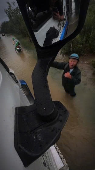 Người cha vẫy xe để con đi nhờ, còn ông quay lại tự xoay xở với chiếc xe máy ngập nước.